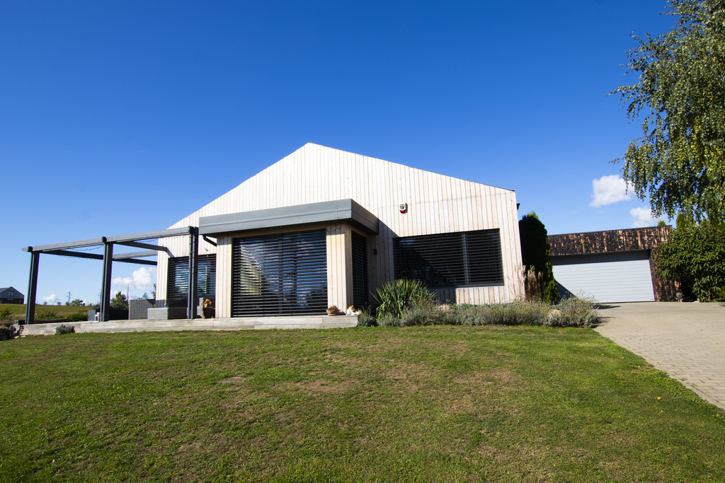 Zum Verkauf steht ein Haus in der malerischen Stadt Moczyły, 15 Minuten vom Zentrum von Stettin entfernt, in der Gemeinde Kołbaskowo. Das Haus liegt auf einer leichten Anhöhe, die eine tolle Aussicht bietet. Die Lage des Anwesens ist ein außergewöhnlich ruhiger, malerischer Ort, erfüllt von der Schönheit der umgebenden Natur, die Harmonie und Ruhe nach einem aufregenden Tag voller Arbeit und Pflichten gewährleistet. Der Ort lädt zum Ausruhen und Aufladen der Batterien ein, zur Entspannung nach der Rückkehr nach Hause, was bekanntlich für mehr Effizienz und Kreativität im Alltag sorgt. Ein freistehendes, einstöckiges Haus mit ungenutztem Dachboden, ohne Keller, gedeckt mit einem Steildach. Die Architektur des Gebäudes, einfache, moderne, rechteckige Form mit einem Dach mit einer erweiterten Garage für zwei Autos. Die gesamte Form des Gebäudes ist in gemischten Farben gehalten. Das Ganze gibt einen tollen visuellen Effekt. Tischlerarbeiten teilweise aus Aluminium und grauem PVC. An der Südseite wurde eine Holzterrasse angelegt, wobei Holzpfähle als Unterkonstruktion zum Abspannen des Segeltuchs im Sommer dienten. Das Haus ist äußerst funktional gestaltet, die Anordnung der Zimmer bietet jedem Mitglied des Haushalts Freiheit, Komfort und Ruhe, dank der Anordnung des Schlafbereichs (Schlafzimmer, Badezimmer, Kleiderschränke) und des Nutzbereichs (Wohnzimmer, Büro, Küche und Esszimmer) in zwei äußersten Teilen des Hauses. Das Haus ist wunderschön mit hochwertigen Materialien ausgestattet. Das Haus ist modern und sehr geschmackvoll eingerichtet. Eingang zum Haus durch eine hübsch dekorierte Halle mit großem Einbauschrank, zu einem geräumigen Wohnzimmer mit Kamin und Ausgang zur Terrasse, von wo aus man einen wunderschönen Blick auf einen wunderschön angelegten Garten mit Blumen und Sträuchern hat Blick auf die Natur der umliegenden Landschaften, ein Wohnzimmer, das mit einem Esszimmer verbunden ist, von dem aus es in die Küche mit Speisekammer übergeht. Wohnzimmer verbunden mit dem Büro. Vom Wohnzimmer führt ein Flur zu den Nebenzimmern von zwei Kinderzimmern, denen ein Badezimmer und ein Ankleidezimmer gewidmet sind. Ein Schlafzimmer mit Ankleideraum mit einem Badezimmer mit Sauna, Badewanne, Dusche, Waschbecken und Toilette. Das Haus verfügt außerdem über einen Raum für die technische Infrastruktur einer Wärmepumpe, eine Waschküche und eine Doppelgarage. Liste der Räume: – Eingangskorridor – Wohnzimmer, Esszimmer, Küche – Speisekammer – Arbeitszimmer – Waschküche – Badezimmer (Badewanne, Waschbecken, Toilette) – Zimmer 1 – Zimmer 2 (eine Trennwand zwischen den Zimmern mit der Möglichkeit des Abrisses ) – Schlafzimmer mit separatem Kleiderschrank und Badezimmer mit Badewanne, Dusche, Sauna, Waschbecken und Toilette – Ankleideraum – Hauswirtschaftsraum – Doppelgarage Flächen: – Gebäudefläche 252,14 m2 – Nutzfläche 181,99 m2 – Garagenfläche 36,18 m2 – Gebäudelänge 19,87 m – Gebäudebreite 17, 86 m – Erdgeschossniveau 36,55 m über dem Meeresspiegel Das Grundstück hat eine Fläche von 2192 m2 und ist wunderschön mit Pflanzen, Bäumen, Sträuchern und Blumen angelegt. Der sich ausbreitende Duft von Lavendel, der Anblick blühender Blumen und vielfältiger Farben der Natur, Vogelgesang und der Anblick wunderschöner Schmetterlinge lassen selbst den leidenschaftlichsten Tetrizier das Herz schmelzen. Von Nordwesten nach Südosten erstreckt sich ein rechteckähnliches Grundstück. Auf dem Grundstück, entlang der Auffahrt, gibt es eine separate Hundebox und eine Wirtschaftseinrichtung für Holz und landwirtschaftliche Geräte, das Ganze sieht durch die Verwendung von Abbruchziegeln für den Bau sehr beeindruckend aus, was den Charakter einer Kombination aus rustikalem Charakter verleiht Stil mit Modernität, der für einen Wow-Effekt sorgt. Ein Pavillon mit bewachsener Feuerstelle mit Festtafel und Grill vermittelt das Gefühl, Zeit in mediterranen Urlaubsdestinationen zu verbringen. Ein äußerst freundlicher und angenehmer Ort, um bei romantischen Abendessen und lebhaften Gesprächen mit Freunden und Familie Zeit miteinander zu verbringen. – ein Gemüsehändler, der die Möglichkeit bietet, Ihre eigenen Öko-Lebensmittel mit einem Nebengebäude für Gartengeräte anzubauen. Der Bereich von der Seite der Zufahrtsstraße mit einem Ziegelzaun aus Abbruchziegeln mit einer hölzernen Eingangszone, an seinen längeren Seiten mit einem Maschendrahtzaun und einem teilweise hölzernen Zaun von der Kreisstraße (Moczyły – Kamieniec). Eingang und Eingang zum Grundstück durch ein Schiebetor und eine Pforte mit Gegensprechanlage. Verwendete Technik und Materialien: Das gesamte Gebäude wird auf durchgehende Fundamente gestellt. Auf Höhe der Bänke wurde eine Bandentwässerung mit der Entwässerung der Anlage zum Entwässerungsbecken ausgeführt. Grundmauern th. 24 cm, aus B25 Betonsteinen. isoliert mit 8-10 cm dickem extrudiertem Polystyrol, abgedeckt mit Noppenfolie. Außen- und Konstruktionswände aus Porenbetonsteinen des Systems YTONG, Stärke 36,5 cm und 40 cm in der Garage auf Herstellerdünnklebemörtel. Ein Teil der Innenwände besteht aus SILKA-Blöcken, Dicke: 18cm. 12 cm dicke Innentrennwände aus Porenbeton des Systems YTONG. YTONG Stürze und Systemträger. Satteldach mit Blechdach in Falzplatten von Pruszyński. Mit Silikonputz verputzte Außenwände, auf denen eine Unterkonstruktion für eine Holzfassade aus Brettern mit