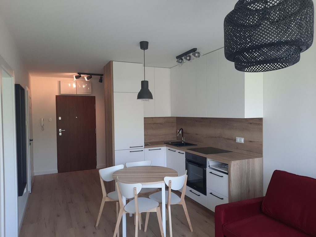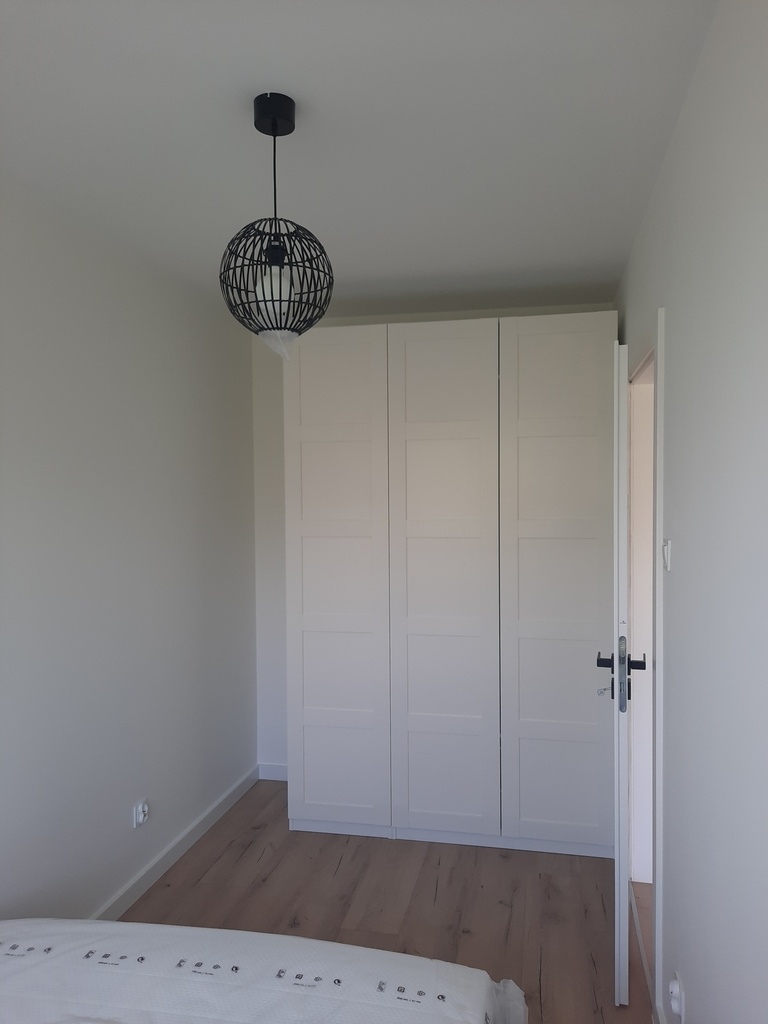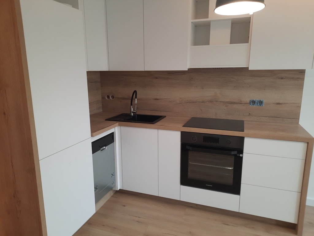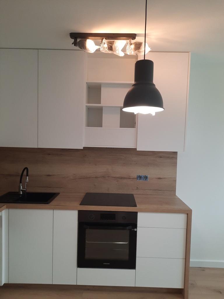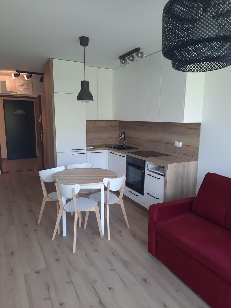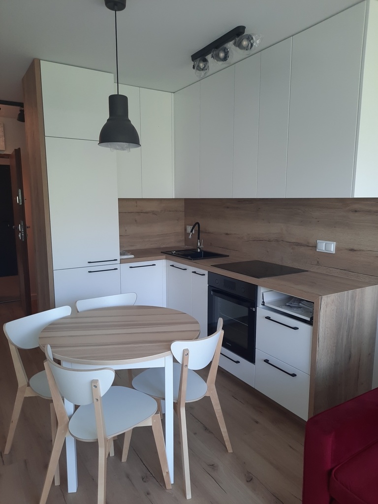Eine 2-Zimmer-Wohnung mit einer Fläche von 34,71 m2 befindet sich im 4. Stock eines neuen Mehrfamilienhauses aus dem Jahr 2022 mit Aufzug in Gumieńce. Wohnzimmer mit Kochnische, 16,32 m2, Schlafzimmer 8,60 m2, Badezimmer – 4,60 m2, Flur 5,19 m2. Balkon 3,50 m2. Fernwärme und Warmwasser. Hoher Ausbaustandard der Wohnung. BADEZIMMER: Steinzeugfliesen an Wänden und Boden. Begehbare Duschwand aus Glas, Thermostatmischer, Regenduschkopf und separater Grohe-Duschkopf, linearer Abfluss im Boden. Waschbecken mit 60-cm-Unterschrank (2 Schubladen), Holzplatte, Grohe-Wasserhahn. Spiegel mit Wandlampe. Waschmaschinenanschluss. Toilette auf einem Rahmen in einem Steinzeuggebäude. Badezimmertür Polskone, Typ Fiord, schwarze Griffe. KÜCHE: Einbauküchenmöbel mit Samsung-Haushaltsgeräten (Kühl-Gefrierkombination, Geschirrspüler, Backofen, Kochfeld), Kernau-Haube fest mit dem Abluftkamin verbunden. Schwarzes Waschbecken mit einer Schüssel. Flexibler Spültischmischer, schwarz. Küchentisch aus Holz mit 4 Stühlen – IKEA. WOHNZIMMER: Wände und Decken glatt, mit Flugger-Farben gestrichen. Wasserdichte Bodenplatten von Meister. Sockelleisten aus MDF-Platte, 8 cm hoch. Deckenvorhangstangen mit IKEA Majgul-Vorhängen. Ein 3-Sitzer-Schlafsofa mit Schlaffunktion und einem Behälter für Bettwäsche LUKAS – AGATA MEBLE. Teppich. Couchtisch mit Holzregal – IKEA HEMNES. TV-Schrank aus Holz – IKEA HEMNES. SCHLAFZIMMER: Wände und Decken glatt und mit Flugger-Farben gestrichen. Wasserdichte Bodenplatten von Meister. Sockelleisten aus MDF-Platte, 8 cm hoch. Deckenvorhangstangen mit IKEA Majgul-Vorhängen. IKEA BJORBEKK Graphit-Polsterbett 140 cm mit AKREHAMN-Hartschaummatratze und abnehmbarem Bezug. Nachttisch. Schwarze Hängelampe und Steh-Nachttischlampe. SAAL. Garderobenschrank – IKEA PAX. Ein Spiegel in einem schwarzen Rahmen. Beleuchtung. Wird sofort veröffentlicht.
