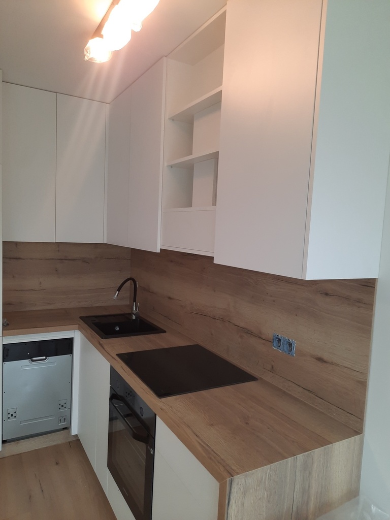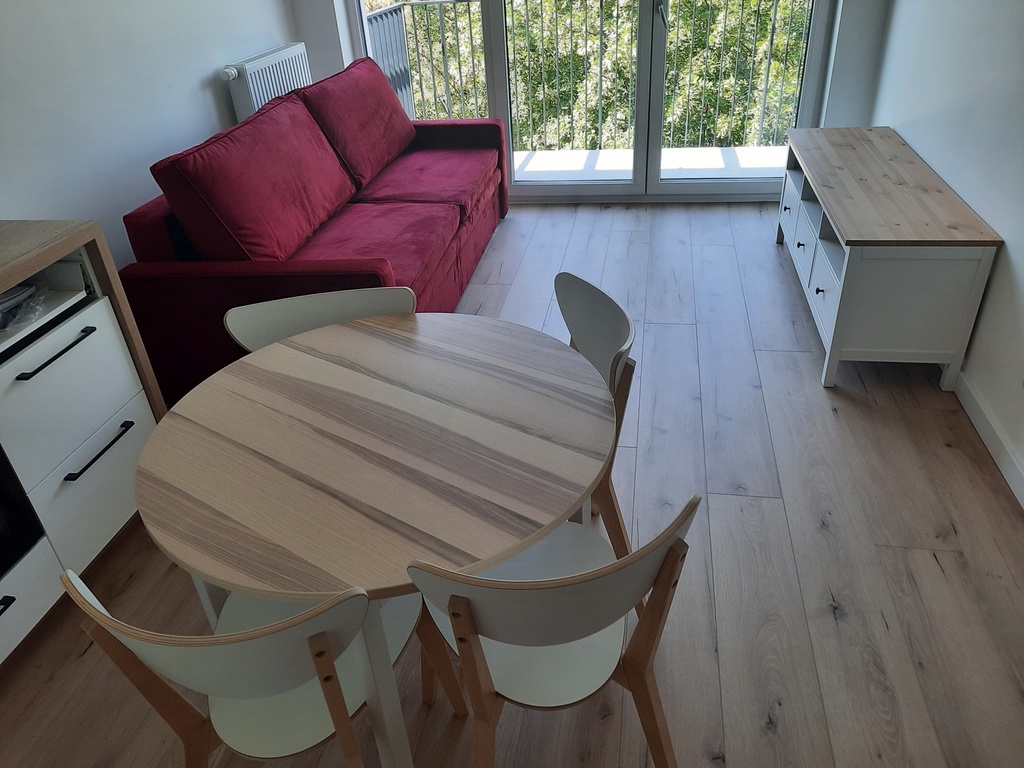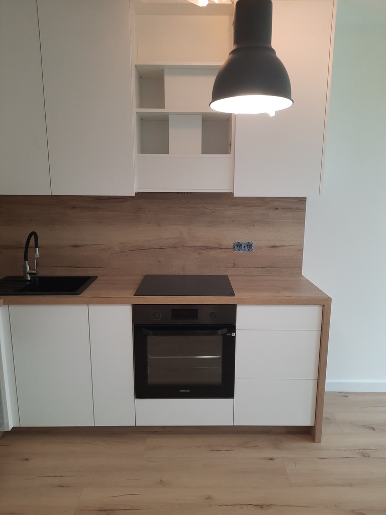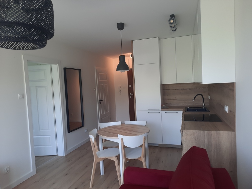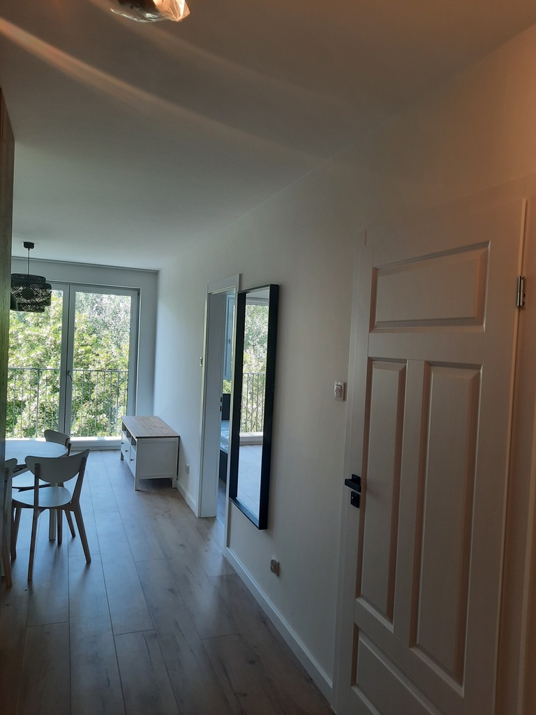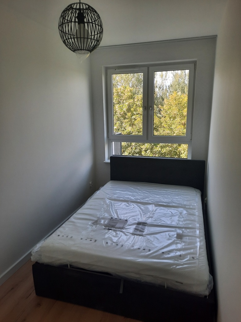 Eine 2-Zimmer-Wohnung mit einer Fläche von 34,71 m2 befindet sich im 4. Stock eines neuen Mehrfamilienhauses aus dem Jahr 2022 mit Aufzug in Gumieńce. Wohnzimmer mit Kochnische, 16,32 m2, Schlafzimmer 8,60 m2, Badezimmer – 4,60 m2, Flur 5,19 m2. Balkon 3,50 m2. Fernwärme und Warmwasser. Hoher Ausbaustandard der Wohnung. BADEZIMMER: Steinzeugfliesen an Wänden und Boden. Begehbare Duschwand aus Glas, Thermostatmischer, Regenduschkopf und separater Grohe-Duschkopf, linearer Abfluss im Boden. Waschbecken mit 60-cm-Unterschrank (2 Schubladen), Holzplatte, Grohe-Wasserhahn. Spiegel mit Wandlampe. Waschmaschinenanschluss. Toilette auf einem Rahmen in einem Steinzeuggebäude. Badezimmertür Polskone, Typ Fiord, schwarze Griffe. KÜCHE: Einbauküchenmöbel mit Samsung-Haushaltsgeräten (Kühl-Gefrierkombination, Geschirrspüler, Backofen, Kochfeld), Kernau-Haube fest mit dem Abluftkamin verbunden. Schwarzes Waschbecken mit einer Schüssel. Flexibler Spültischmischer, schwarz. Küchentisch aus Holz mit 4 Stühlen – IKEA. WOHNZIMMER: Wände und Decken glatt, mit Flugger-Farben gestrichen. Wasserdichte Bodenplatten von Meister. Sockelleisten aus MDF-Platte, 8 cm hoch. Deckenvorhangstangen mit IKEA Majgul-Vorhängen. Ein 3-Sitzer-Schlafsofa mit Schlaffunktion und einem Behälter für Bettwäsche LUKAS – AGATA MEBLE. Teppich. Couchtisch mit Holzregal – IKEA HEMNES. TV-Schrank aus Holz – IKEA HEMNES. SCHLAFZIMMER: Wände und Decken glatt und mit Flugger-Farben gestrichen. Wasserdichte Bodenplatten von Meister. Sockelleisten aus MDF-Platte, 8 cm hoch. Deckenvorhangstangen mit IKEA Majgul-Vorhängen. IKEA BJORBEKK Graphit-Polsterbett 140 cm mit AKREHAMN-Hartschaummatratze und abnehmbarem Bezug. Nachttisch. Schwarze Hängelampe und Steh-Nachttischlampe. SAAL. Garderobenschrank – IKEA PAX. Ein Spiegel in einem schwarzen Rahmen. Beleuchtung. Wird sofort veröffentlicht.
