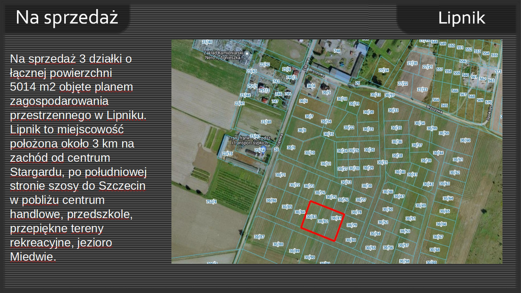 Land zu verkaufen 5014 m²LipnikZachodniopomorskie9/10114/OGS 10247206 1 200 000 PLN: 239,33 PLN 239,33FechtenKeinerLot5014 m²Lot-TypWohnhausLot FormRechteckDriveway TypGehärtetStromJaWasserJaGasJa
