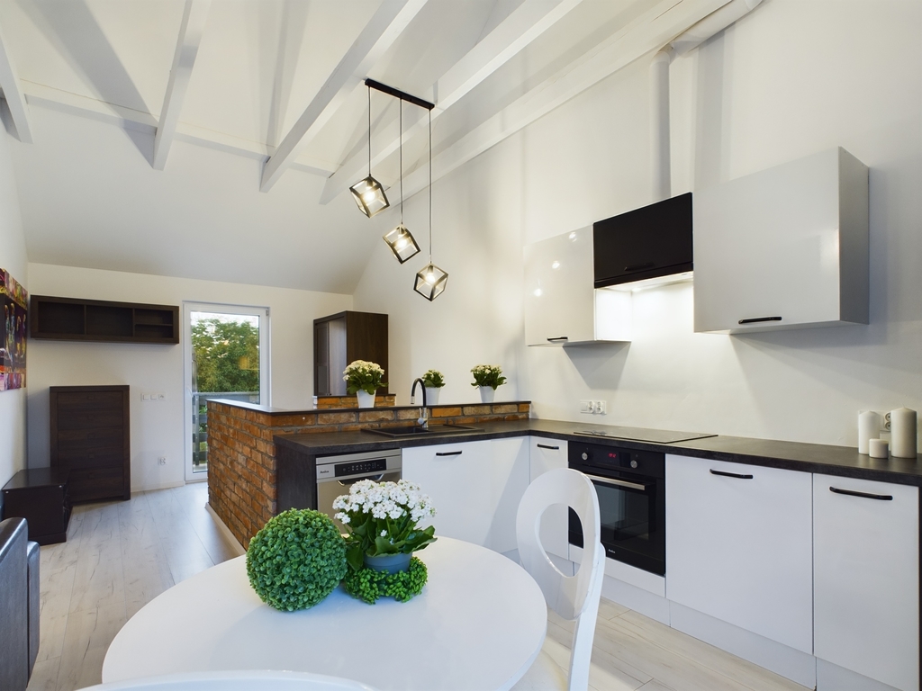 Wir laden Sie ein, sich mit dem Angebot einer schönen Wohnung mit einer Fläche von 61,44 m2 mit zwei Balkonen und einem Parkplatz für zwei Autos vertraut zu machen. Die Raumaufteilung erfolgt über eine Treppe das Erdgeschoss. Im ersten Stock befinden sich: – ein geräumiges Wohnzimmer in Form eines offenen Raumes mit offener Küche und Zugang zu zwei Balkonen – auf beiden Seiten der Wohnung, – ein helles Badezimmer mit Badewanne, Waschbecken, Toilette und ein Leiterheizkörper – ein Schlafzimmer mit Zugang zum Balkon – ein Zimmer Zusätzlich ein ungenutzter Dachboden zum Aufbewahren von Dingen. Der Ausbau- und Ausstattungsstandard der Wohnung ist in einwandfreiem Zustand – es sind keine finanziellen Aufwendungen erforderlich. Elegant und stilvoll verarbeitet. Ausgestattet und bezugsfertig. Die Küche ist mit Einbaumöbeln und Haushaltsgeräten ausgestattet: Geschirrspüler, Kühl-Gefrierkombination, Dunstabzugshaube, Backofen, Induktionskochfeld. Das Wohnzimmer verfügt über eine Sofagarnitur und Schränke. Das Schlafzimmer verfügt über ein großes Bett, einen Schreibtisch und eine Kommode. Im Badezimmer gibt es eine Waschmaschine. Dreifach verglaste Fenster mit elektrischen Jalousien – ferngesteuert. Fußbodenheizung im Wohnzimmer mit Küche, Bad und Flur. Heizkörper in den Schlafzimmern. Nebenkosten und Gebühren Heizung und Warmwasser aus einem Brennwertgasofen. Mietfreie Wohnung! Strom, Gas und Wasser nach Verbrauch. Sehr niedrige Gebühren aufgrund des hohen Standards an Isolierung und Fenstern. Zusätzlich Müllabfuhr. Internet und Fernsehen auf eigene Faust. Gebäude Das Anwesen befindet sich im ersten Stock eines Einfamilien-Doppelhauses mit zwei Wohneinheiten, das 2021 mit Porotherm gebaut wurde. Das Grundstück ist eingezäunt und befindet sich in einer intimen Lage. Zur Wohnung gehören zwei Parkplätze – der Zugang erfolgt über ein Tor, das mit einer Fernbedienung geöffnet werden kann. Auf der Rückseite des Gebäudes befindet sich ein Garten von ca. 100 m2 zur alleinigen Nutzung. Lage In unmittelbarer Nähe einer Schule, eines Kindergartens, einer Klinik, einer Apotheke und von Geschäften. Transport – Stadtbus. Etwa 9 km bis zum Zentrum von Police, 21 km bis zum Zentrum von Stettin. Diese schöne Wohnung wartet auf ihren neuen Besitzer. Zögern Sie nicht und vereinbaren Sie einen Präsentationstermin. Ich empfehle und lade Sie herzlich ein!