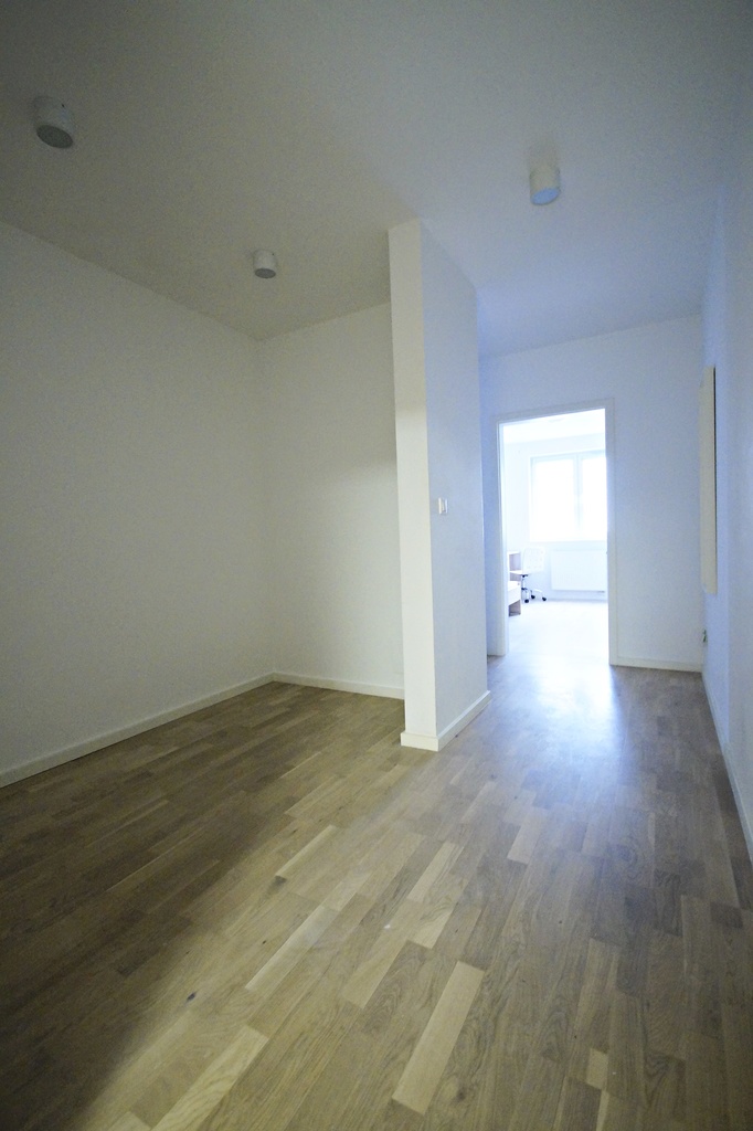 – Flur ca. 8 m2, in der Mitte befindet sich ein Kleiderbügel und ein Schuhschrank, Parkettboden, glatte und gestrichene Wände.