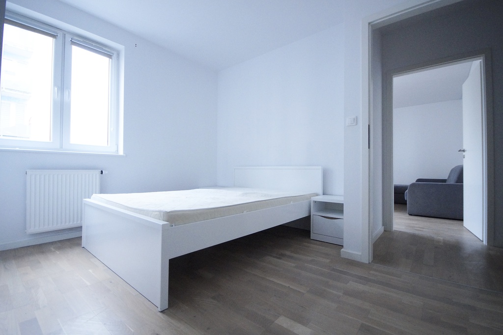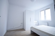 – Raum – Fläche: ca. 12 m2, ausgestattet mit neuen Möbeln – Kleiderschrank, Bett und Schreibtisch, Parkettboden, glatte und gestrichene Wände.