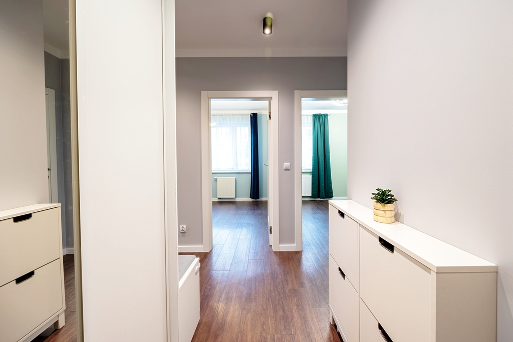 Eine sorgfältig fertiggestellte Dreizimmerwohnung mit einer Gesamtfläche von 72,45 m2 mit Balkon, einem Parkplatz in der Tiefgarage , in einer umzäunten, überwachten Wohnsiedlung – Panoramika.