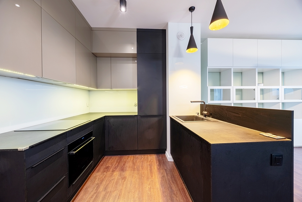 – maßgeschneiderte Küchenmöbel. Lackierte schwarze Schieferfronten. Haushaltsgeräte: Kühlschrank und Geschirrspüler von Bosch,