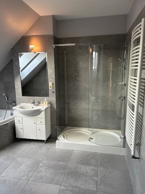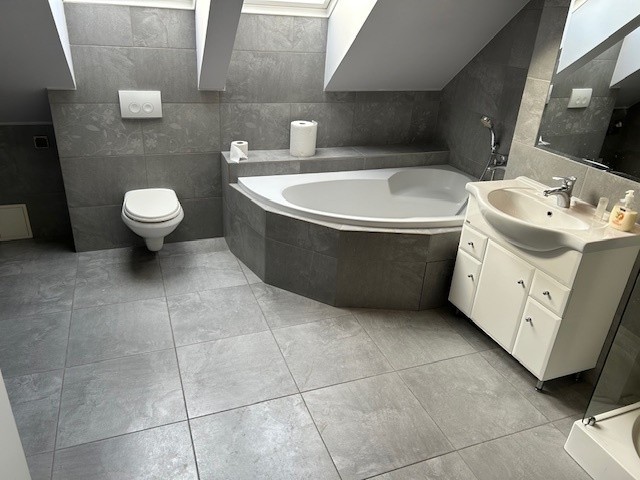 Wohnung 100 m2, im ersten Stock einer neuen Vierfamilien-Doppelhaushälfte in attraktiver Lage. Jede Maisonette verfügt über zwei separate Wohnungen mit separaten Eingängen zum Haus und den Wohnungen. Wohnzimmer mit einer Fläche von 25,4 m2, verbunden mit einer Küchenzeile von 11 m2, insgesamt 36,4 m2, außerdem drei Schlafzimmer: 17,22 m2, 13,68 m2, 11,43 m2. Vom Wohnzimmer aus hat man Zugang zu einem sehr großen Balkon. Ein Badezimmer mit Fenster, verbunden mit einer Toilette mit einer Fläche von 12,64 m2, einer Badewanne, einer Duschkabine und einer Waschmaschine. Die Küche ist möbliert und mit Haushaltsgeräten (Herd mit Backofen, Geschirrspüler, Spüle, Kühlschrank mit Gefrierfach) ausgestattet. Sehr hoher Verarbeitungsstandard. Miete: 3.800 PLN, Nebenkosten: Strom, Gas (Gasheizung), Wasser, Internet, gesamt : ca. 800 PLN/Monat. Ruhige, neu gebaute Wohnung. 2 oberirdische Parkplätze auf dem Grundstück Barriere. Gute Anbindung an das Zentrum sowohl mit dem Auto als auch mit öffentlichen Verkehrsmitteln.