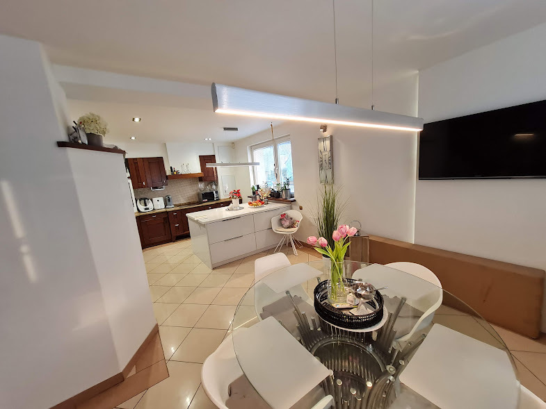 Wir bieten ein Haus in Gumieńce zum Verkauf an. Ein sehr attraktiver Ort mit fußläufiger Anbindung an Verkehrsmittel, Schulen, Kindergärten sowie Einzelhandels- und Dienstleistungsangebote. Ein Doppelhaus, das nur zu einem kleinen Teil mit dem Nachbargebäude verbunden ist, auf einem Grundstück von 597 m² Auf dem Grundstück befindet sich neben dem Haus auch eine Garage mit Nebengebäuden, ideal für die unkomplizierte Führung eines Gewerbebetriebes. Der Zugang zum Anwesen erfolgt über eine bequeme, gepflasterte Auffahrt. Der Rest des Grundstücks ist mit zahlreichen Anpflanzungen schön gestaltet. Das Haus ist unterkellert, im Keller befinden sich eine Waschküche, ein Trockenraum und eine Speisekammer. Im Erdgeschoss befinden sich ein großes Wohnzimmer (ca. 45 m²) mit Zugang zur Terrasse, von der aus man in den Garten gelangt, eine Toilette, eine Küche (ca. 40 m²), ein Gästezimmer und ein Flur. Der erste Stock verfügt über 4 Zimmer, zwei große Schlafzimmer und zwei kleinere Zimmer. Flur und Badezimmer. Von dieser Ebene gibt es einen Ausgang zum Balkon und einen Eingang zum Dachboden. Das Haus wurde in den letzten Jahren renoviert – neues Dach, Fassade, Hausumgebung, Badezimmer, Toilette. Heizung und Warmwasser über eine Gastherme. Wir empfehlen und laden Sie zur Präsentation ein.
