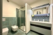 Das Badezimmer verfügt über eine großzügige, verglaste Duschkabine, ein Bidet, ein WC, ein Doppelwaschbecken mit Schubladen und einen zusätzlichen Wandschrank.