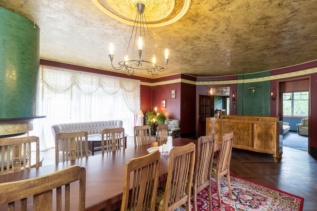 Eine ungewöhnliche Immobilie zum Verkauf mit einer Fläche von über 800 m2, auf einem Grundstück von 4327 m2 gelegen, die sowohl Wohnkomfort als auch interessante Geschäftsmöglichkeiten bietet. Das Herzstück des Hauses ist ein fast 50 Quadratmeter großer Lounge-/Clubraum, an den sich eine voll ausgestattete Küche, zwei Schlafzimmer und ein Badezimmer mit einer Fläche von 17,5 m2 anschließen. Das Haus wird durch einen breiten Eingang mit Kristallverglasung betreten, wir passieren eine geräumige Halle und dann gehen wir zu einer großen Garage und einer Toilette. Die komplett verglaste Westwand des Clubraums gibt den Blick frei auf einen großzügigen, dezenten Patio. Es ist ein charmanter Ort mit einem dekorativen Brunnen, Pflanzenbepflanzung und einem gemauerten Grill. Die Terrasse besteht aus einem offenen Raum, hat aber auch eine große überdachte Fläche. Vom zentral gelegenen Wohnzimmer aus gelangt man ebenfalls zum Treppenhaus. Auf der gleichen Ebene befindet sich auch eine Wohnung: Wohnzimmer, Schlafzimmer, separate Küche und Badezimmer. Im ersten Stock, auf der linken Seite der Treppe, befindet sich ein 50 Meter großer Raum mit einem stilvollen Kamin und einem Zwischengeschoss. An dieses Zimmer grenzt eine Küchenzeile, ein 10-Meter-Badezimmer und eine große überdachte Terrasse. Auf der rechten Seite des Treppenhauses befindet sich eine große, sonnige Wohnung mit Terrasse und Dachfenstern. Es umfasst eine Küche (16,5 m2), ein Wohnzimmer mit Terrasse (36,3 m2), das wir auf den Bildern als Fitnessraum eingerichtet haben, von diesem Raum aus gehen wir in die Halle, die uns zu zwei Schlafzimmern und einem Badezimmer führt. Die gesamte Wohnung hat eine Fläche von fast 120m2. Das Erdgeschoss und das Untergeschoss bestehen aus einer 55 m2 großen Zweizimmerwohnung mit Küche und Bad, einem Swimmingpool mit einer Fläche von über 100 m2 und einer Tiefe von 2 m sowie einem Squashraum, sowie eine 30-Meter-Garage und ein Heizraum. Das Haus ist gasbeheizt. Im Kesselraum befindet sich ein Ofen, der die Luft in den Tanks erwärmt und durch die Lüftungskanäle in alle Räume drückt. Es gibt keine Heizungen in den Zimmern, es gibt Lüftungsgitter, um die Hitze abzublasen. Das gesamte Anwesen kann an das „Smart Home“-System angeschlossen werden. Das Angebot ist einzigartig auf dem heimischen Markt, es bietet großartige Möglichkeiten für die geschäftliche Nutzung. Sie können Yoga- und Tanzworkshops, Aufenthalte oder als Generationenhaus für eine große Familie organisieren. Angrenzender Park auf einem Grundstück von 6500 m2, der auch verkauft werden kann. Ich lade Sie zur Präsentation ein, die leicht zu einem interessanten Abenteuer werden kann.