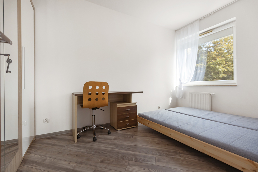 The apartment itself is 48 square meters, consisting of a living room with a relaxation and dining area, and an open-plan kitchen. A separate bedroom with a spacious wardrobe, a bed, and a desk is also available. A comfortable bathroom with a shower, washing machine, sink, toilet, and storage space is also available. The hallway has a large built-in wardrobe. The interior is decorated in neutral colors: beige, gray, and white. The apartment is furnished, the kitchen is equipped with appliances, and the windows have cassette blinds. There is also a clothes dryer and a vacuum cleaner. Access to the apartment is via a beautiful and clean staircase with a quiet elevator accessible from level -1, ensuring comfort and safety. A parking space in the garage is included, and the utility fee is PLN 300 per square meter. Administrative fees are PLN 350. Hot water, heating in the winter, and electricity are based on consumption. A one-month security deposit is required. Keys are available in the office. You’re welcome to come and visit.