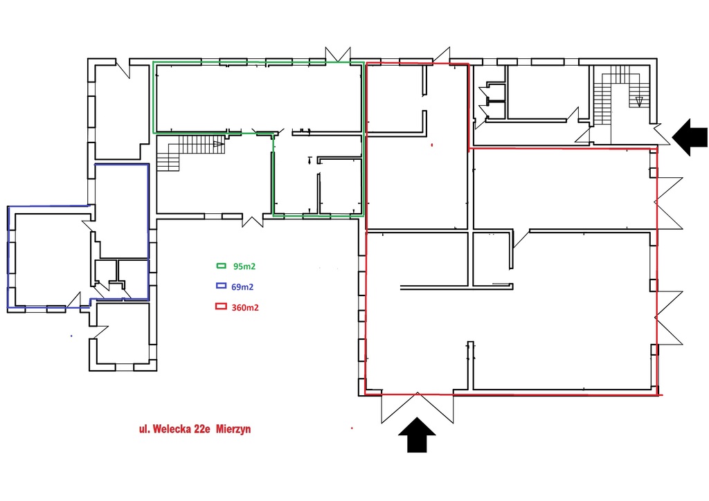 Office space 69m2 on the ground floor with social facilities + parking spaces. The rentable area on the plan is marked in navy blue. Building from the 90s. Excellent visibility of the object. 24h access. Large advertising space included in the price. The facility is safe – constantly supervised. Advantages: – 3 office rooms – social area – warehouse Rent PLN 3,500/month net + VAT + electricity. Other utilities included in the rent. Deposit required. An ideal area for an office, a shop – trade, a small warehouse, services. It is possible to rent a larger area of 360 m2 (office and storage space).