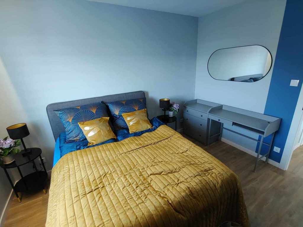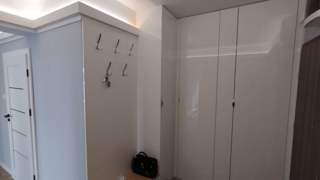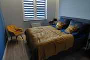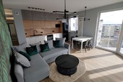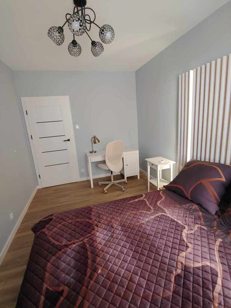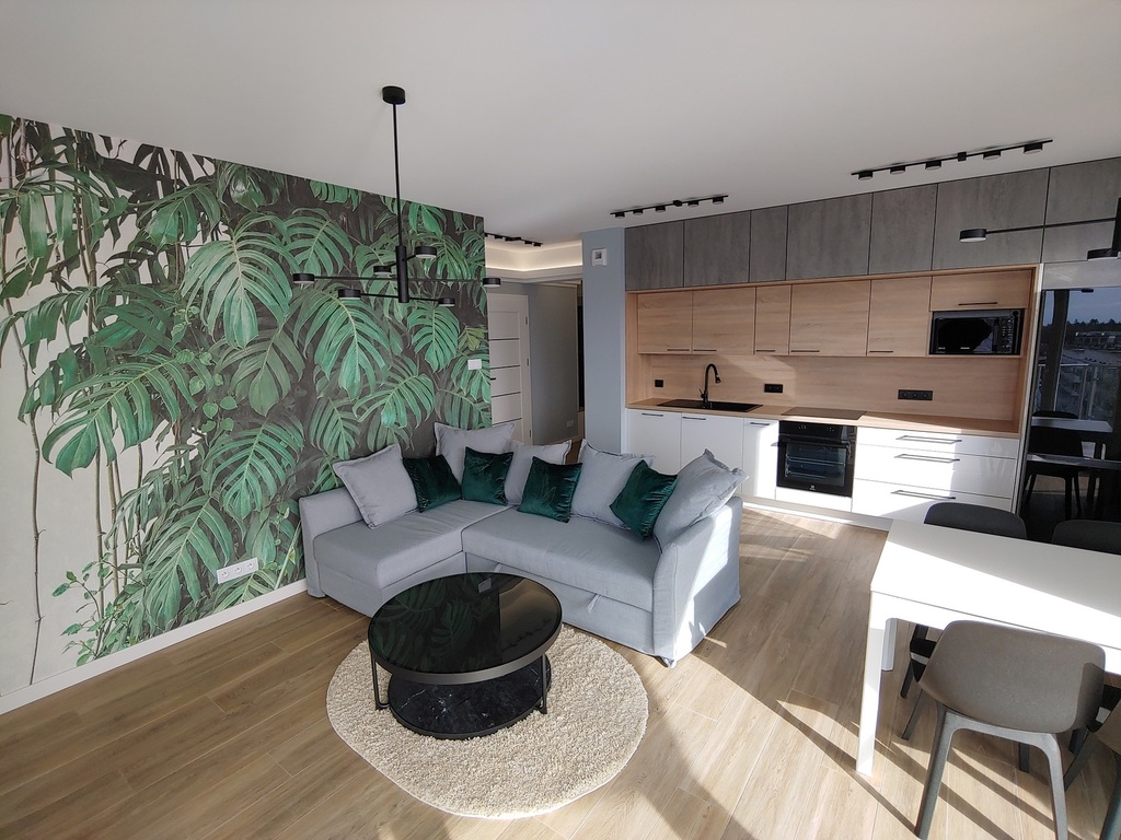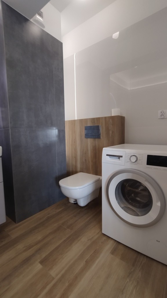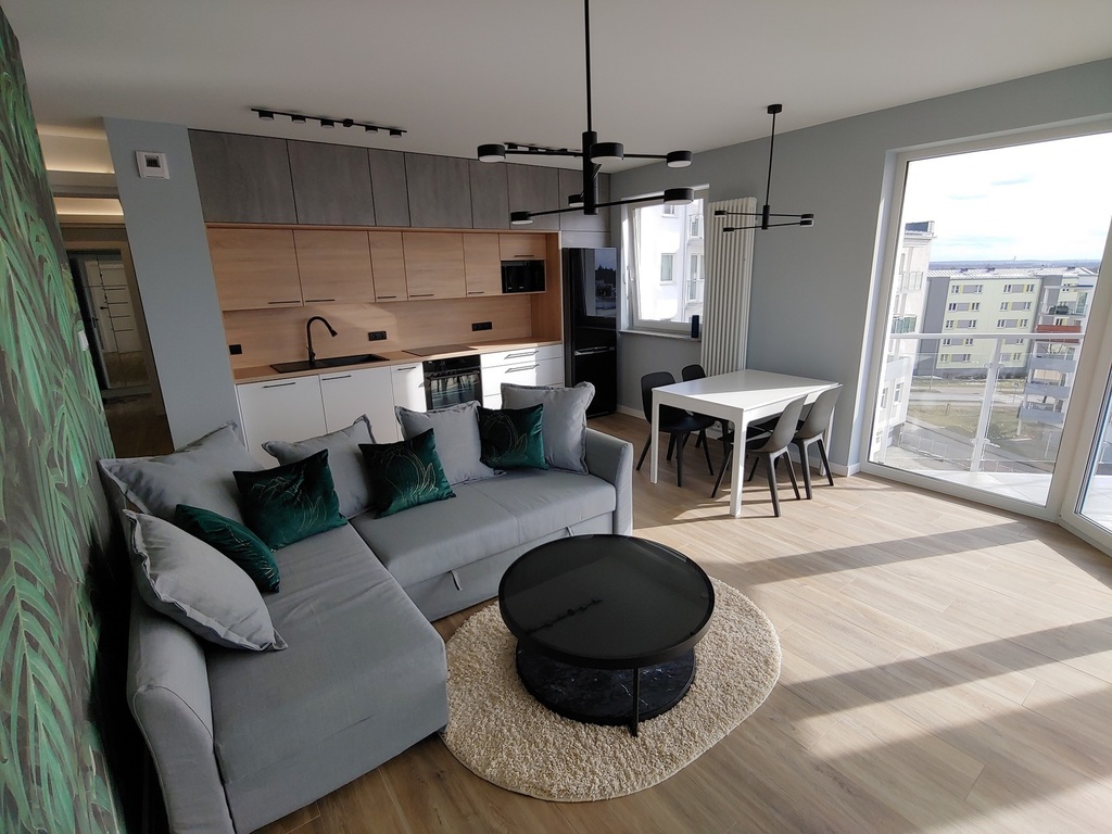 A spacious apartment, not yet inhabited, located in a new housing estate in the quiet city center. Three rooms – a large furnished living room with a kitchenette (fully furnished and equipped kitchen) with access to a sunny, spacious terrace. 13m2. Terrace with an open, unobstructed view. Two bedrooms with an area of over 11 m2 each, furnished. In addition, a very large dressing room with a window (9 m2). Bathroom with toilet, with bathtub. The apartment uses very interesting lighting solutions. The attached garage is included in the rental price, and there is also an option to rent the adjacent garage. The "Stokrotka" shop is very close. Occasional rental, minimum contract duration is 2 years. The rent is PLN 4,200 + administrative fees of PLN 558 and a garage fee of PLN 62. Two-month deposit. Rental available immediately.