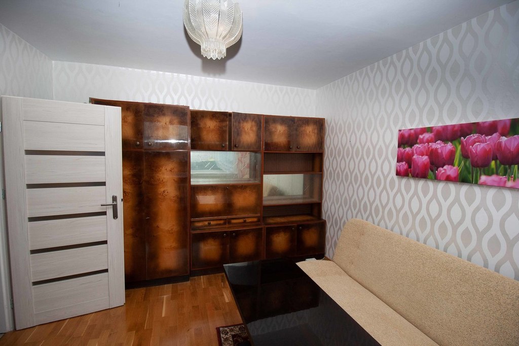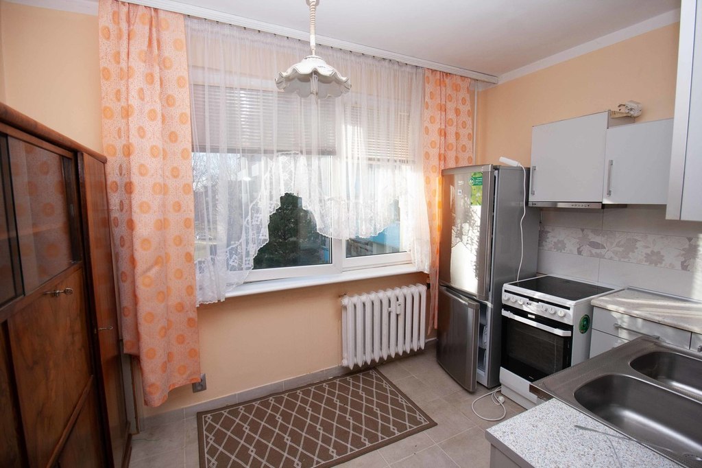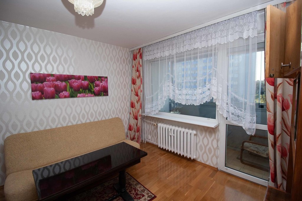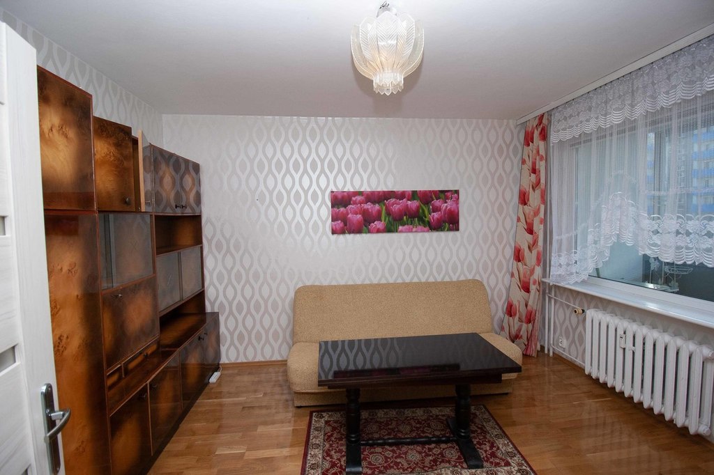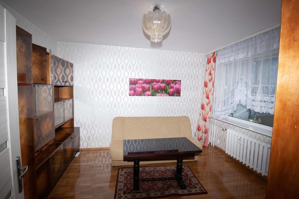 Studio apartment 28.3 m2 on the 2nd floor of a low block with an elevator. Apartment after renovation, oak board on the floor in the room, wallpaper walls, PVC windows, large balcony on the west side, built-up – glazing. Separate, large kitchen with a window – electric cooker. Bathroom in new tiles and terracotta, with a bathtub. Heating and hot water from the municipal network – rent PLN 325. The place is conveniently located – close to shops, city market, school, clinic and public transport. There are many public parking spaces next to the building.