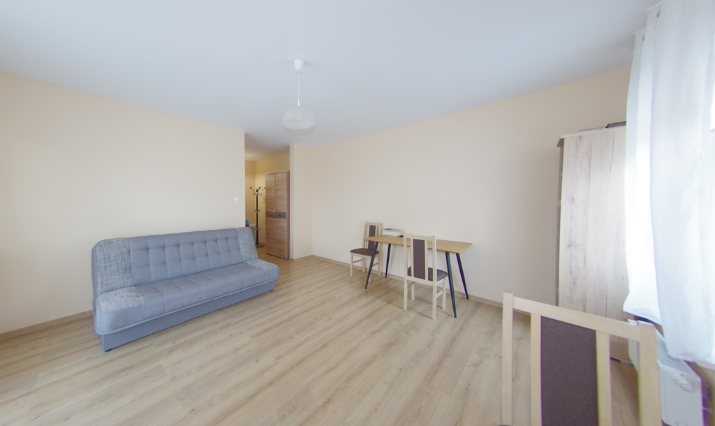Only here. Offer of a large, new studio apartment (can be converted into a two-room apartment). The apartment is finished – panels on the floors, plaster walls – painted, tiles and terracotta in the bathroom, a shower cubicle. Cabinets and household appliances in the kitchen. In the hall there is a wardrobe (you can make a large building to size). Low maintenance costs, the current rent is PLN 162. Hot water and heating from SECu.