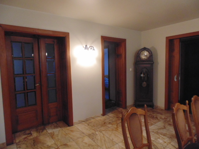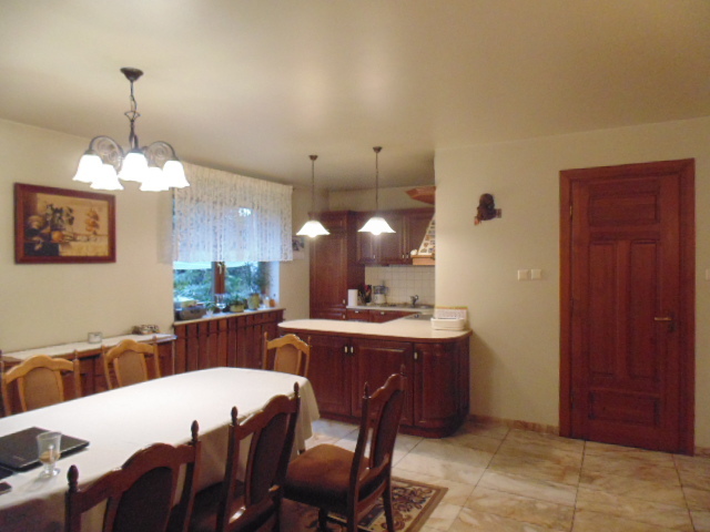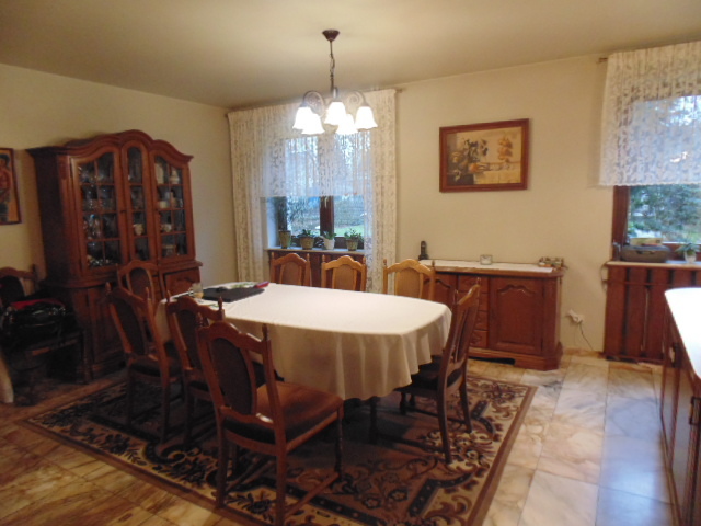 Spacious house for sale: 9 rooms, three large garages of the area. one about 50m2 and the other two with an area 24.72 m2. The house is situated on a large plot of land approx. 1500 m2. The house has a very interesting location in Gumieńce and is perfect for families and business. The house, built in 1991, has a very nice shape, an envelope roof. Insulated building. Ground floor with an area 110 m2 is occupied by a spacious kitchen with a dining room of the area. 41m2, living room 36m2. On this level, there are also two scheduled rooms with an area of approx. 15 and 13 m2 separated by a corridor, bathroom with a shower cabin and a handy wardrobe. Oak stairs from the living room lead to the first floor. At this level we have: -salon with an area approx. 36m2 -4 rooms: with an area of 15-13m2, one with a large balcony across the width of the room – a large bathroom with a bathtub with glazed tiles and terracotta. The house was built with great care. Natural onyx stone is laid on the floors in the kitchen and dining room, oak parquet on the floor in the living rooms, carpeting in the rooms, wooden door joinery made to measure. The garden is very nicely landscaped, numerous ornamental plantings. I recommend and invite you to the presentation.