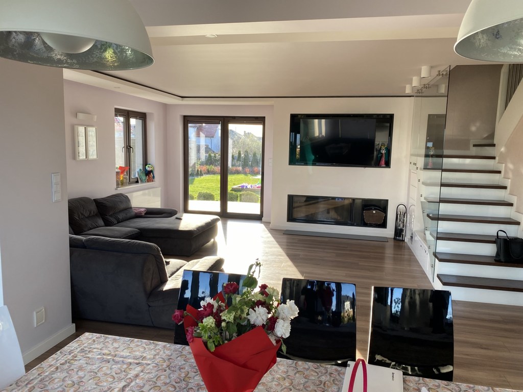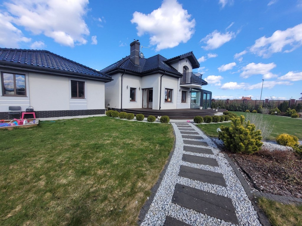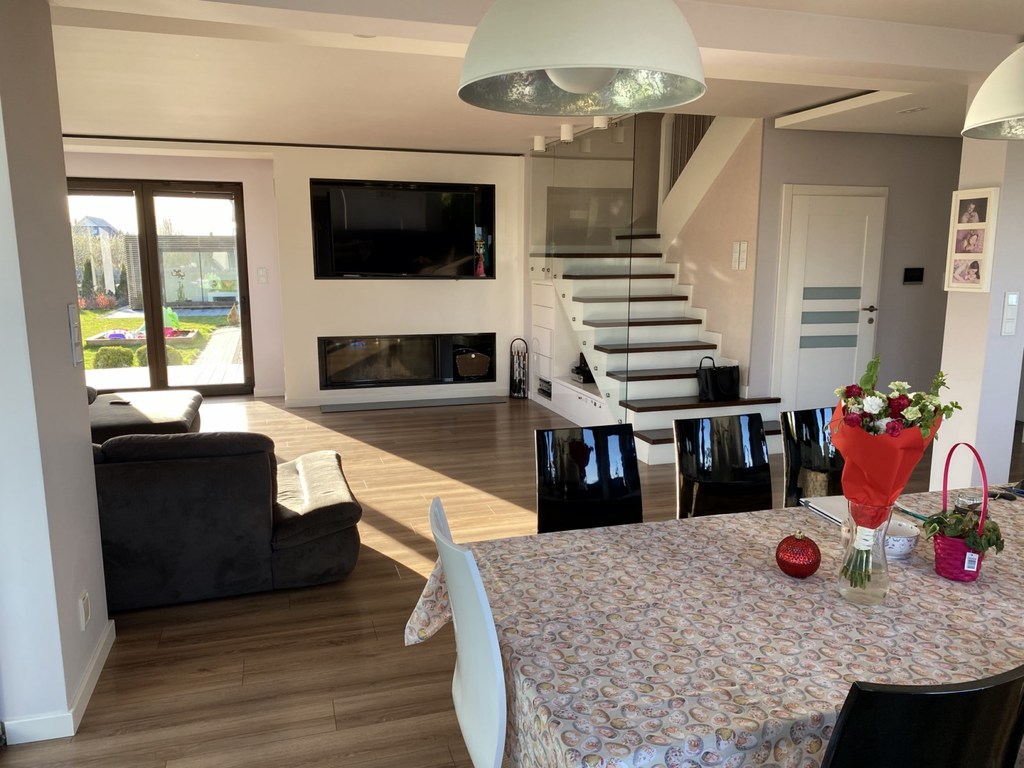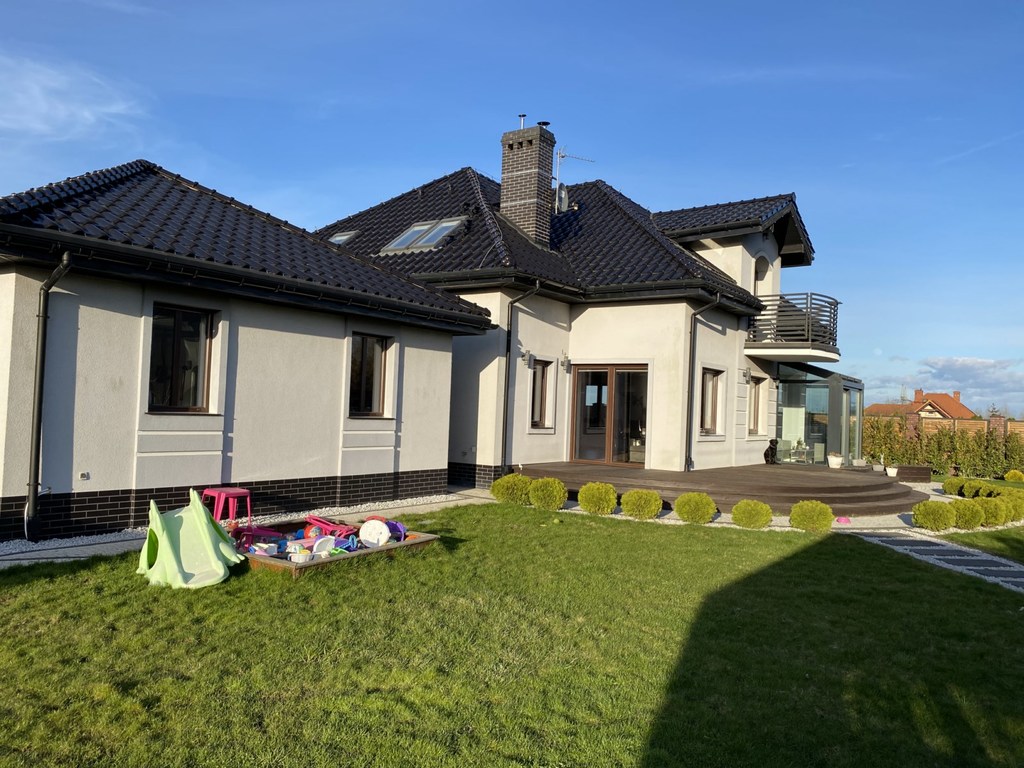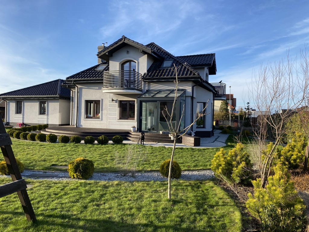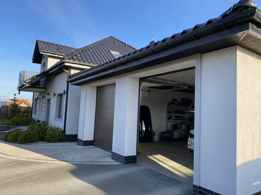 Mierzyn. A new detached house from 2017, located on a hill with a beautiful view of the panorama of Szczecin in the most prestigious part of Mierzyn. The house is situated on a plot of 1538 m2 with a one-story structure with an attic. It has a usable area of 220 m2 and a total area of 317 m2, which includes: 3 bedrooms, a study, a living room, 3 bathrooms, a dressing room, a utility room, a washer-dryer and a boiler room. A glazed winter garden with an entrance from the living room was added to the building. Next to it, there is a detached garage building for 4 cars with an area of approximately 75 m2 with two garage doors opened with a remote control. Two entrance gates to the property also open with a remote control. Both buildings, i.e. residential and garage, are made of porotherm, insulated with polystyrene 20 cm overlapping, finished with washable silicate plaster in light colors, the roofs of the buildings are covered with Robben ceramic tiles in graphite color. The well-maintained, tastefully landscaped garden has a distributed irrigation system, two wells collecting rainwater, garden lighting, communication paths, anti-mole netting, driveways finished with cobblestone. In addition, a gazebo and a building for fitness are located in the garden, which can be used as an office building for business purposes. The house has an alarm system and a central vacuum cleaner. On the ground floor, there is a spacious vestibule with a large built-in 3-door wardrobe, a 15 m2 office, a laundry and drying room and a boiler room with a modern Buderus stove with an internal combustion chamber and fully automatic with a water tank with a capacity of 150 L. A spacious living room with an area of 35 m2 combined with a dining room of 11 m2 and a kitchen of 25 m2, elegant high-quality panels on the floor, white Asilo interior doors, which are characterized by timeless design and solid construction. Triple-pane PVC windows with wooden veneer. In the living room there is a Spartherm panoramic fireplace with a raised glass. Above the fireplace there is a large 60-inch Sony TV set, corner sofa, table, chairs – complete furniture included in the price of the house. From the living room, two exits to the garden, one to a large three-stage terrace finished with a wooden board. Elegantly equipped kitchen with built-in kitchen furniture with lacobel fronts, granite countertops, induction hob, electric oven, microwave oven, large dishwasher, two absorbers leading to the chimney, large two-door fridge-freezer. The stairs leading to the first floor are poured stairs with wooden overlays with a glass wall from the living room side with LED backlight. On the first floor, there are 3 bedrooms, a double bedroom with an entrance to the dressing room and a large bathroom illuminated by a roof window with a shower, bathtub, toilet, bidet and a washbasin, elegantly finished with tiles and terracotta. The second bathroom with an area of 14 m2 with an entrance from the hall with two roof windows, a very large bathtub, washbasin, toilet and bidet is elegantly finished. The other 2 bedrooms have an area of 13 and 15 m2 with exits to balconies. In addition, the house has an attic, which can be accessed by folding ladder stairs closed with a ceiling hatch. The house is new, well-maintained, tastefully decorated, finished with the highest quality materials, in a great location. In close proximity to school, kindergarten, public transport stop. The property is worth recommending, I invite you to the presentation.