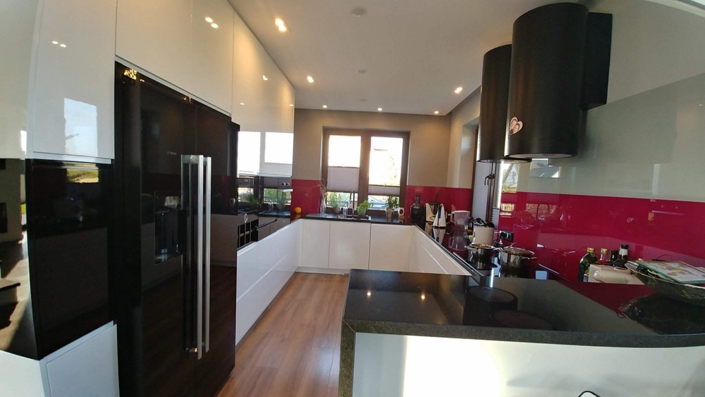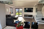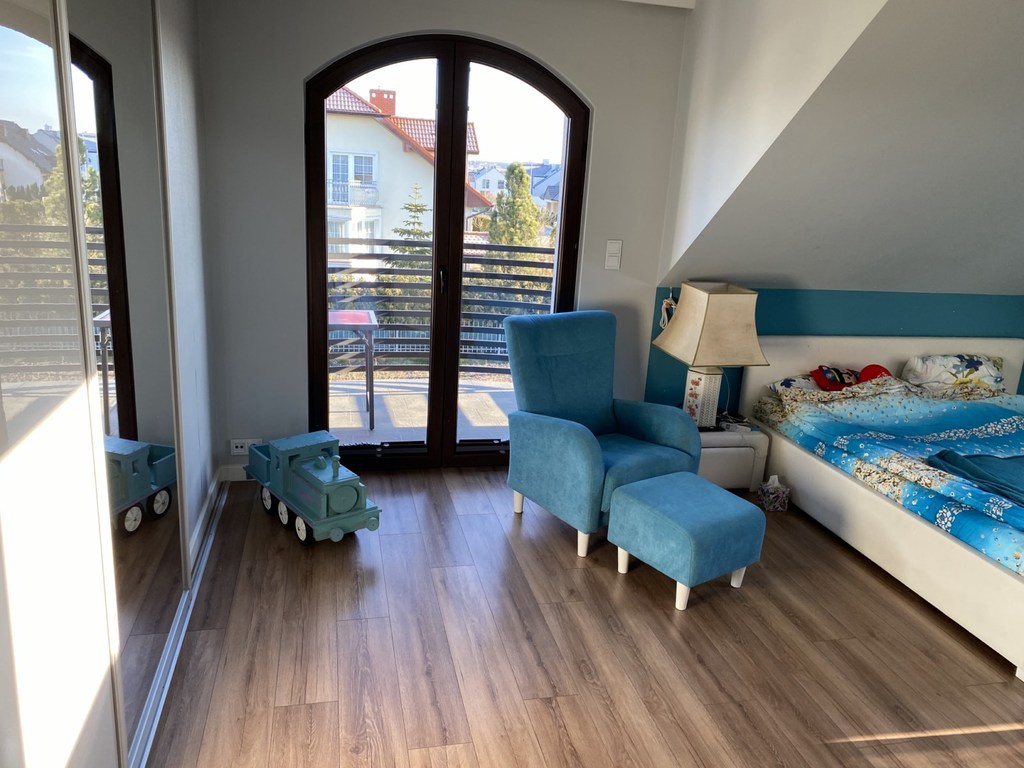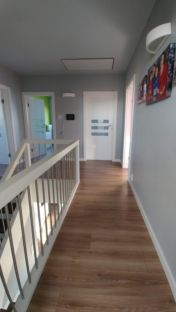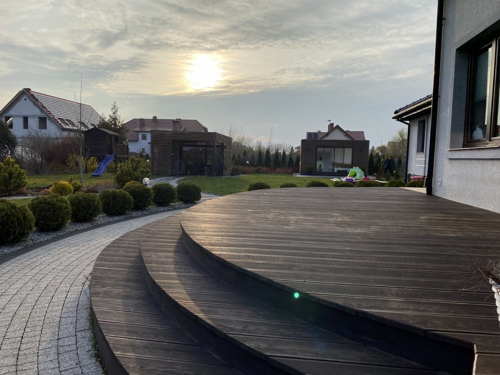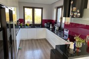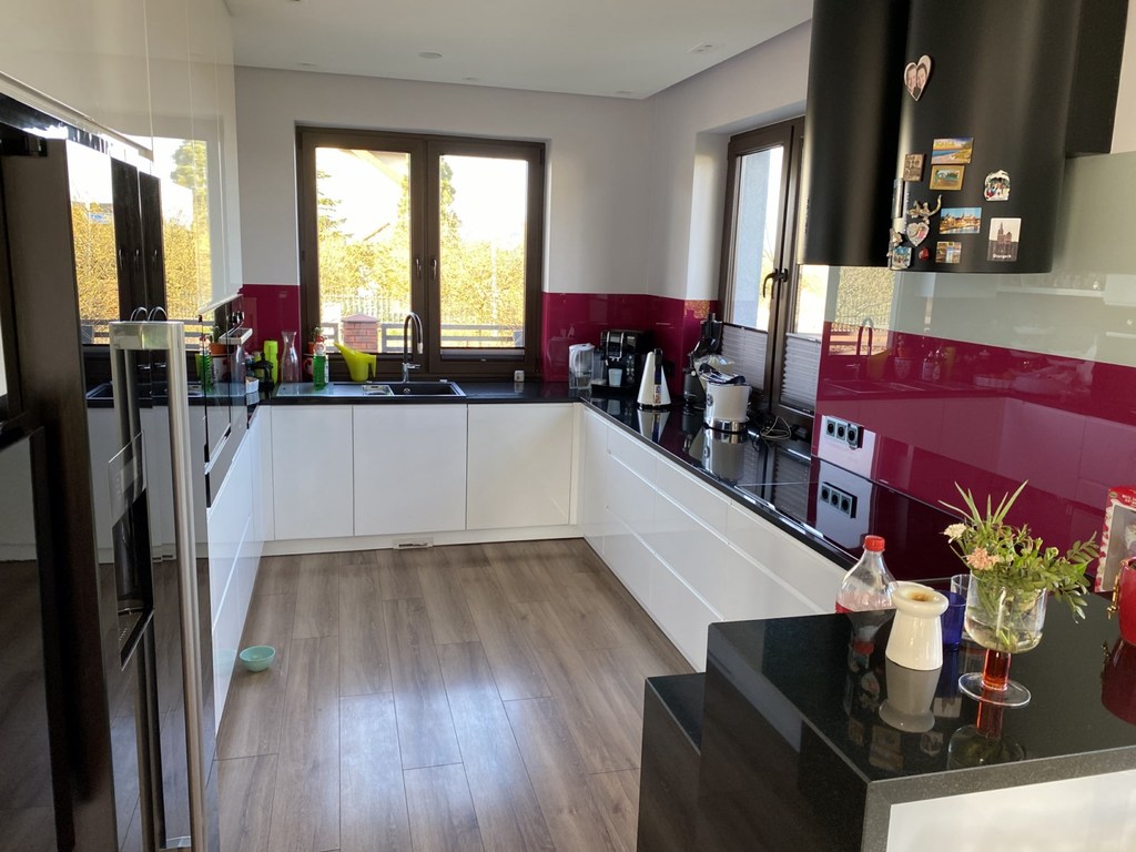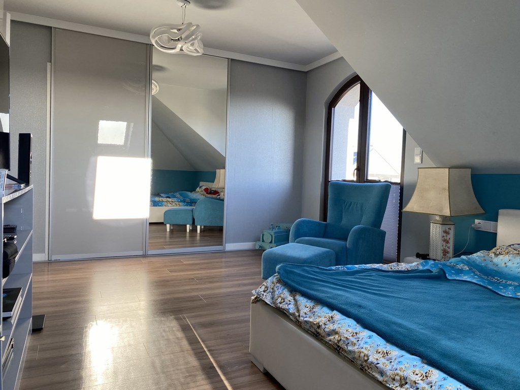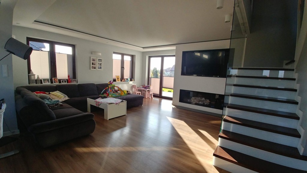 Mierzyn. A new detached house from 2017, located on a hill with a beautiful view of the panorama of Szczecin in the most prestigious part of Mierzyn. The house is situated on a plot of 1538 m2 with a one-story structure with an attic. It has a usable area of 220 m2 and a total area of 317 m2, which includes: 3 bedrooms, a study, a living room, 3 bathrooms, a dressing room, a utility room, a washer-dryer and a boiler room. A glazed winter garden with an entrance from the living room was added to the building. Next to it, there is a detached garage building for 4 cars with an area of approximately 75 m2 with two garage doors opened with a remote control. Two entrance gates to the property also open with a remote control. Both buildings, i.e. residential and garage, are made of porotherm, insulated with polystyrene 20 cm overlapping, finished with washable silicate plaster in light colors, the roofs of the buildings are covered with Robben ceramic tiles in graphite color. The well-maintained, tastefully landscaped garden has a distributed irrigation system, two wells collecting rainwater, garden lighting, communication paths, anti-mole netting, driveways finished with cobblestone. In addition, a gazebo and a building for fitness are located in the garden, which can be used as an office building for business purposes. The house has an alarm system and a central vacuum cleaner. On the ground floor, there is a spacious vestibule with a large built-in 3-door wardrobe, a 15 m2 office, a laundry and drying room and a boiler room with a modern Buderus stove with an internal combustion chamber and fully automatic with a water tank with a capacity of 150 L. A spacious living room with an area of 35 m2 combined with a dining room of 11 m2 and a kitchen of 25 m2, elegant high-quality panels on the floor, white Asilo interior doors, which are characterized by timeless design and solid construction. Triple-pane PVC windows with wooden veneer. In the living room there is a Spartherm panoramic fireplace with a raised glass. Above the fireplace there is a large 60-inch Sony TV set, corner sofa, table, chairs – complete furniture included in the price of the house. From the living room, two exits to the garden, one to a large three-stage terrace finished with a wooden board. Elegantly equipped kitchen with built-in kitchen furniture with lacobel fronts, granite countertops, induction hob, electric oven, microwave oven, large dishwasher, two absorbers leading to the chimney, large two-door fridge-freezer. The stairs leading to the first floor are poured stairs with wooden overlays with a glass wall from the living room side with LED backlight. On the first floor, there are 3 bedrooms, a double bedroom with an entrance to the dressing room and a large bathroom illuminated by a roof window with a shower, bathtub, toilet, bidet and a washbasin, elegantly finished with tiles and terracotta. The second bathroom with an area of 14 m2 with an entrance from the hall with two roof windows, a very large bathtub, washbasin, toilet and bidet is elegantly finished. The other 2 bedrooms have an area of 13 and 15 m2 with exits to balconies. In addition, the house has an attic, which can be accessed by folding ladder stairs closed with a ceiling hatch. The house is new, well-maintained, tastefully decorated, finished with the highest quality materials, in a great location. In close proximity to school, kindergarten, public transport stop. The property is worth recommending, I invite you to the presentation.