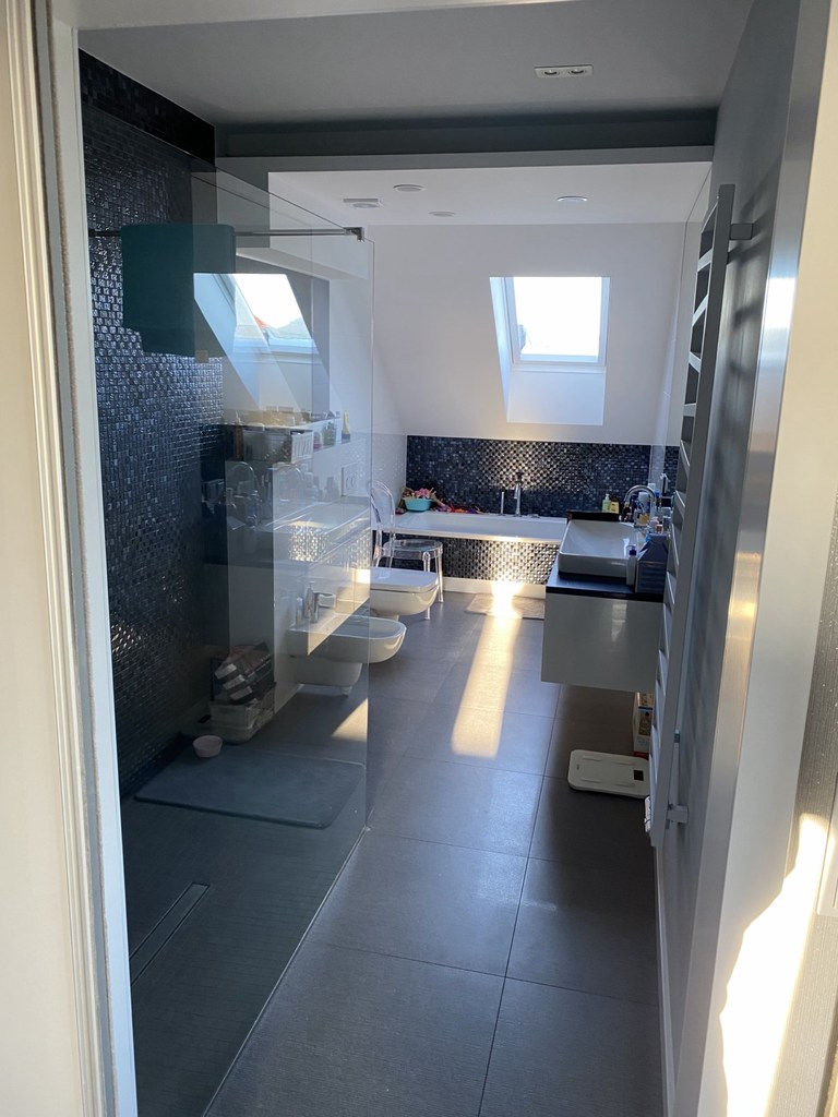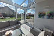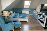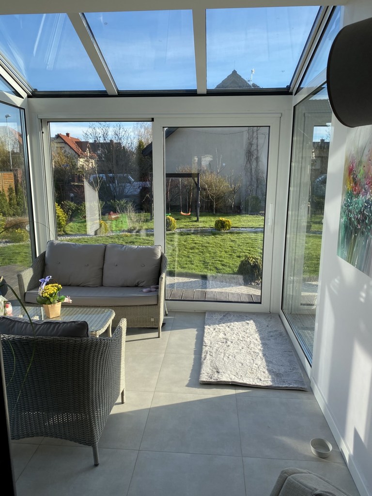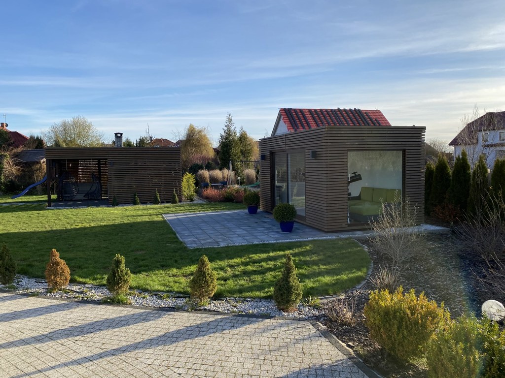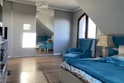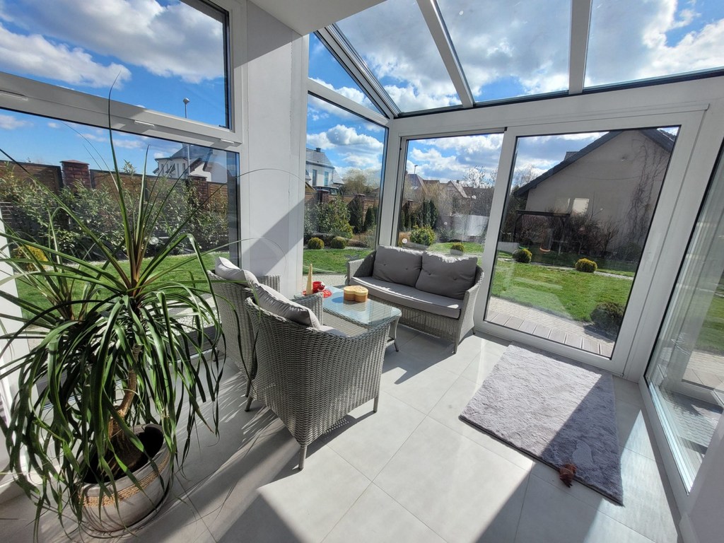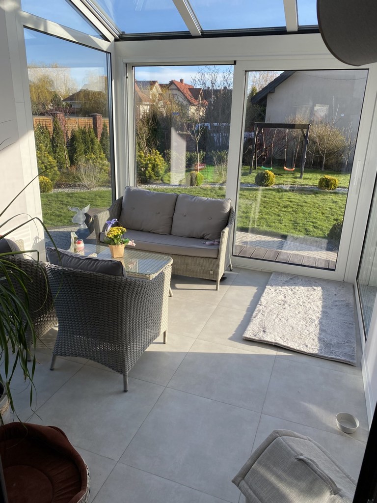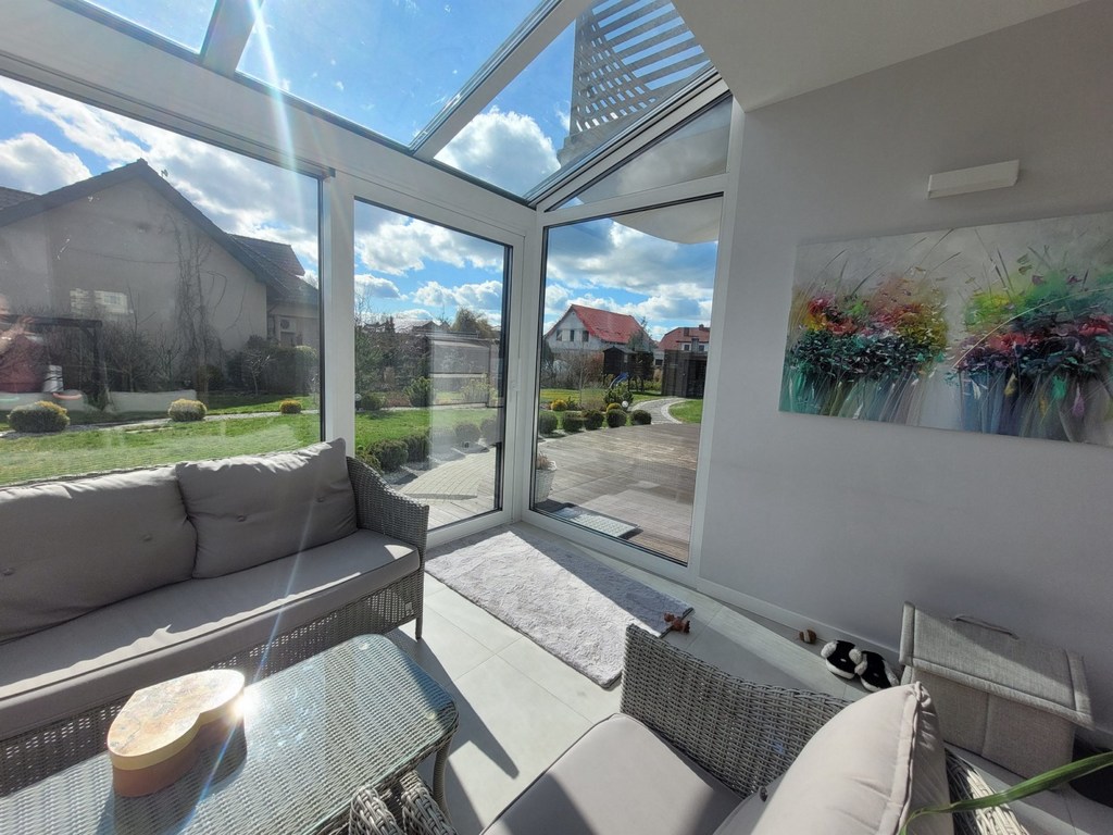 Mierzyn. A new detached house from 2017, located on a hill with a beautiful view of the panorama of Szczecin in the most prestigious part of Mierzyn. The house is situated on a plot of 1538 m2 with a one-story structure with an attic. It has a usable area of 220 m2 and a total area of 317 m2, which includes: 3 bedrooms, a study, a living room, 3 bathrooms, a dressing room, a utility room, a washer-dryer and a boiler room. A glazed winter garden with an entrance from the living room was added to the building. Next to it, there is a detached garage building for 4 cars with an area of approximately 75 m2 with two garage doors opened with a remote control. Two entrance gates to the property also open with a remote control. Both buildings, i.e. residential and garage, are made of porotherm, insulated with polystyrene 20 cm overlapping, finished with washable silicate plaster in light colors, the roofs of the buildings are covered with Robben ceramic tiles in graphite color. The well-maintained, tastefully landscaped garden has a distributed irrigation system, two wells collecting rainwater, garden lighting, communication paths, anti-mole netting, driveways finished with cobblestone. In addition, a gazebo and a building for fitness are located in the garden, which can be used as an office building for business purposes. The house has an alarm system and a central vacuum cleaner. On the ground floor, there is a spacious vestibule with a large built-in 3-door wardrobe, a 15 m2 office, a laundry and drying room and a boiler room with a modern Buderus stove with an internal combustion chamber and fully automatic with a water tank with a capacity of 150 L. A spacious living room with an area of 35 m2 combined with a dining room of 11 m2 and a kitchen of 25 m2, elegant high-quality panels on the floor, white Asilo interior doors, which are characterized by timeless design and solid construction. Triple-pane PVC windows with wooden veneer. In the living room there is a Spartherm panoramic fireplace with a raised glass. Above the fireplace there is a large 60-inch Sony TV set, corner sofa, table, chairs – complete furniture included in the price of the house. From the living room, two exits to the garden, one to a large three-stage terrace finished with a wooden board. Elegantly equipped kitchen with built-in kitchen furniture with lacobel fronts, granite countertops, induction hob, electric oven, microwave oven, large dishwasher, two absorbers leading to the chimney, large two-door fridge-freezer. The stairs leading to the first floor are poured stairs with wooden overlays with a glass wall from the living room side with LED backlight. On the first floor, there are 3 bedrooms, a double bedroom with an entrance to the dressing room and a large bathroom illuminated by a roof window with a shower, bathtub, toilet, bidet and a washbasin, elegantly finished with tiles and terracotta. The second bathroom with an area of 14 m2 with an entrance from the hall with two roof windows, a very large bathtub, washbasin, toilet and bidet is elegantly finished. The other 2 bedrooms have an area of 13 and 15 m2 with exits to balconies. In addition, the house has an attic, which can be accessed by folding ladder stairs closed with a ceiling hatch. The house is new, well-maintained, tastefully decorated, finished with the highest quality materials, in a great location. In close proximity to school, kindergarten, public transport stop. The property is worth recommending, I invite you to the presentation.