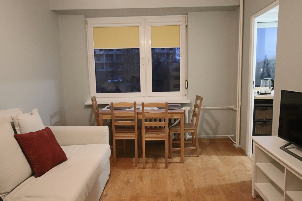 Pomorzany, 2 rooms 34 m2 with a balcony, located on the ground floor of a 4-story block. Apartment after renovation, as new, fully furnished and equipped, first tenants after renovation. It consists of two rooms, a kitchen, a corridor and a bathroom. From the living room there is an entrance to the bedroom with a balcony and to the kitchen, and from the corridor to the bathroom. External blinds on the windows. Insulated building, nice new facade, low rent with heating and hot water. Fees: rent PLN 2,000, administrative rent PLN 420, deposit PLN 2,000 (returnable after the rental agreement). All the furniture is new, there is a table and chairs in the living room, a sofa, a long TV stand, a double fold-out bed in the bedroom, a large wardrobe, a corridor, a large built-in wardrobe, a kitchen with custom-made furniture and a bathroom with a shower cabin and cabinets for cosmetics and cleaning agents . The apartment is clean and tidy, very good standard, for the most demanding client. No pets. The offer is recommendable due to its location, close to public transport, schools, universities, hospitals, shopping centers and shops. To live immediately, I invite you to the presentation