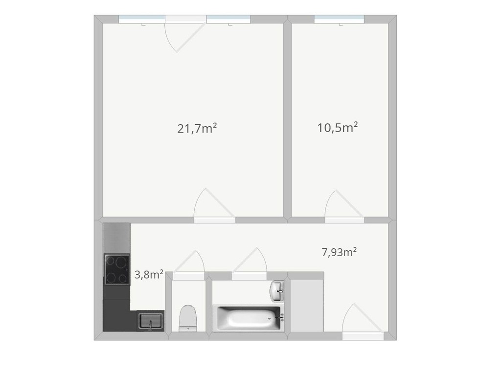 The area is 47.7 m² and consists of a bright living room with a French balcony, a second room and a hall with a capacious wardrobe. The bathroom has a bathtub and a separate toilet, and the kitchen is separate and equipped with a dishwasher, oven, fridge and induction hob. The current layout of the apartment allows you to combine rooms in order to open up more space and arrange it according to your own style.