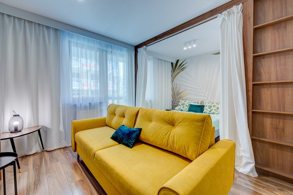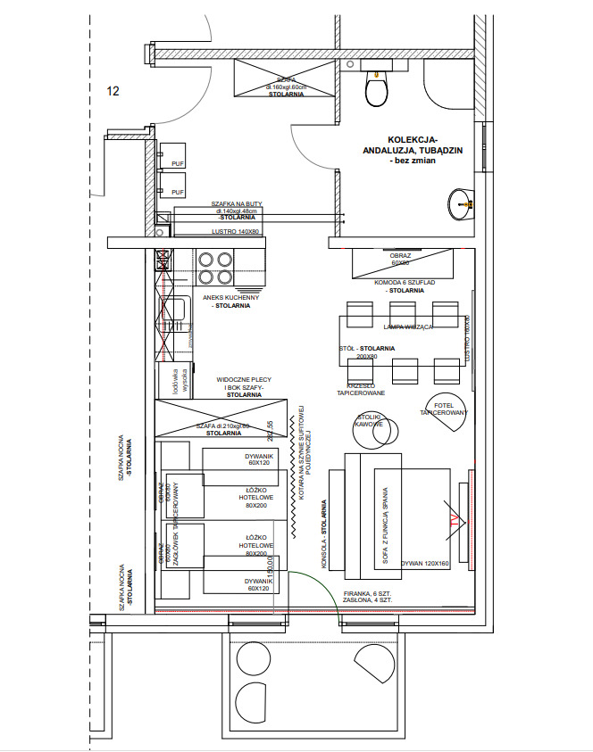 The surface of the apartment is 43.62 m2 and consists of: a large room with a kitchenette and access to a balcony, as well as a separate space constituting a bedroom, a bathroom with a toilet and a corridor.