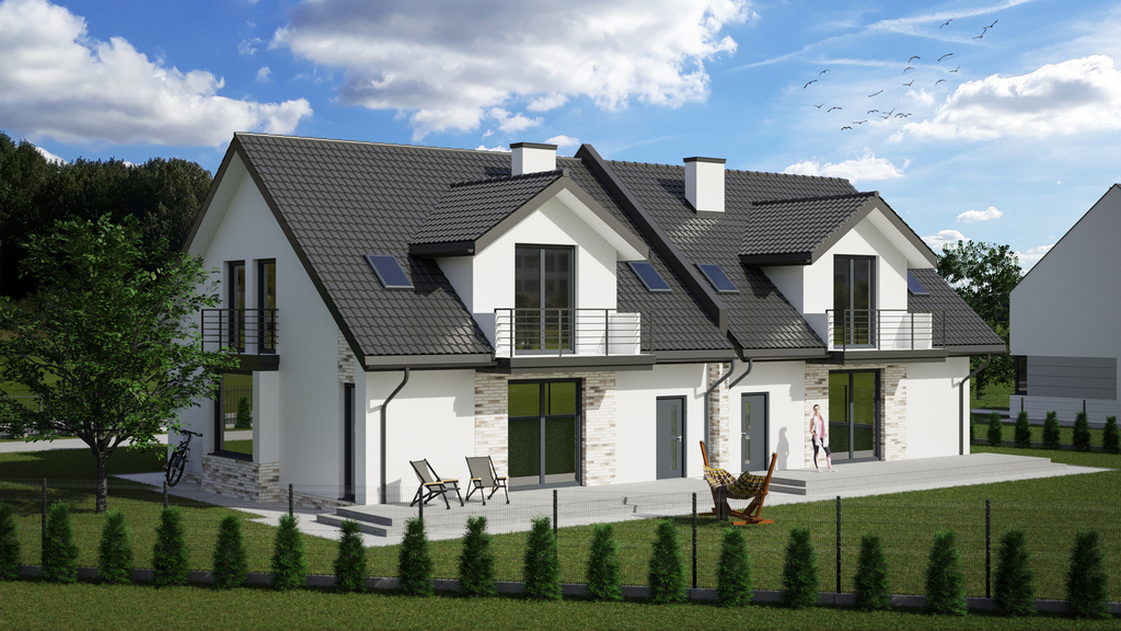 For sale a newly built semi-detached house with a usable area of 140 m2 each, the property is situated on a plot with a total area of over 1700 m2. On the ground floor: vestibule, toilet, living room with access to the terrace, kitchen, garage and boiler room on the first floor 3 rooms, bathroom, dressing room The property will be equipped with water, electricity, sewage system, a heat pump will be used for heating and hot water, there will also be an installation electricity for photovoltaics if the customer wanted to install one on his own. Underfloor heating is provided throughout the building. The property has a place for a fireplace, boiler room and garage. A house built in traditional technology with the use of high-class materials. A concrete fence has been erected from the side of the street. The property is from the primary market, so the buyer does not pay 2% PCC.