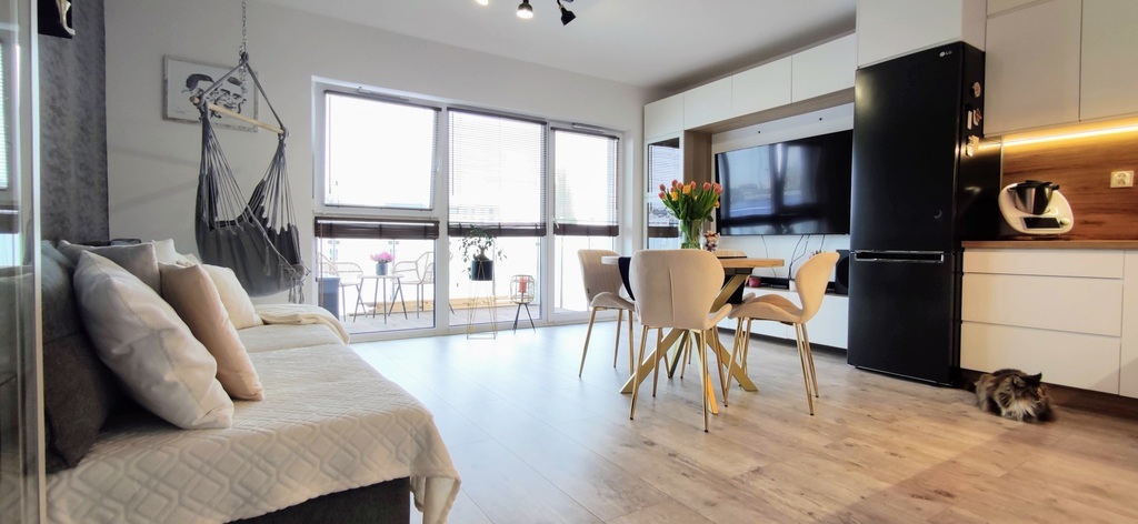 For sale a beautiful 3-room apartment in Kołobrzeg with an area of 53.65 m2, including 2 storage rooms with an area of approx. 1.90 m2 and 2.45 m2 located on the same floor as the apartment, 2 parking spaces – included in the price of the apartment. Apartment: consists of a living room with kitchenette, 2 bedrooms, bathroom, hall, balcony. The apartment is finished to a high standard, with built-in furniture in the form of a kitchenette, wardrobes in the hall and TV cabinets and extensions in the living room. Kitchen furniture equipped with household appliances: fridge with freezer, sink, hood, oven, dishwasher. A sunny, cozy apartment located on the first floor at ul. 1 Maja in Kołobrzeg, in the new housing estate "sunny terraces", exposure of north-west windows. The apartment is located about 1000 m from the city center, about 20 minutes walk to the sea. A new, quiet housing estate, away from the hustle and bustle of the city, yet close to the city center. An ideal place for those who value peace and comfort. In the close vicinity there are numerous supermarkets, shops, public transport stops, bicycle paths, kindergartens, schools, hospitals and clinics. The building has: a bicycle room, storage rooms, mechanical exhaust ventilation, central heating from the municipal network, a fenced and closed area, monitored entrances to the estate, a playground, parking spaces, lots of greenery. Offer available only with us. I recommend