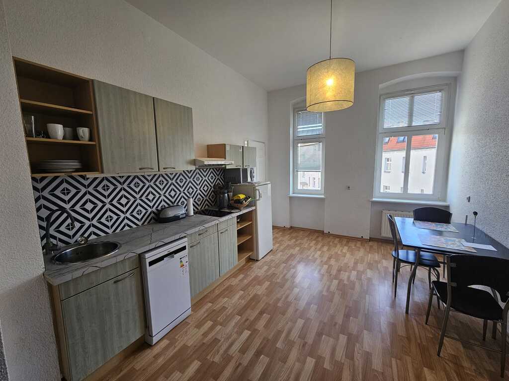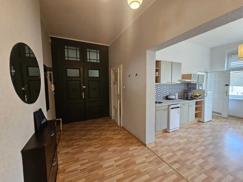 The 114m² apartment is located in the heart of the city center in a restored tenement building with CCTV monitoring on Bogusława Promenade. It faces southwest. Two rooms overlook the restored Wojska Polskiego Street. The living room is open and connected to the hallway, and from the living room you access one of the bedrooms. The kitchen is fully equipped: refrigerator with freezer, gas stove, oven, extractor hood, dishwasher, and microwave. The apartment has two tastefully tiled bathrooms, one with a bathtub, the other with a shower, both with a toilet and a washing machine. The rooms, approximately 24, 23, and 22m², feature laminate flooring. The rooms are furnished. The monthly rent to the Housing Community is PLN 550 (including advance payments for water, heating, and hot water). Municipal heating is provided by the apartment's own boiler room. Orange Internet is fiber-optic. The apartment is ideal for a quiet business/company due to its central location and proximity to other businesses, or for a family or as an investment rental. Available from September. Price negotiable.