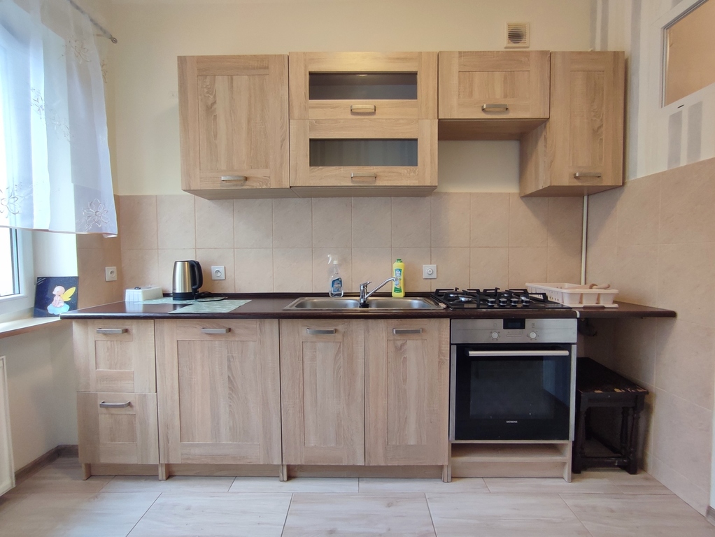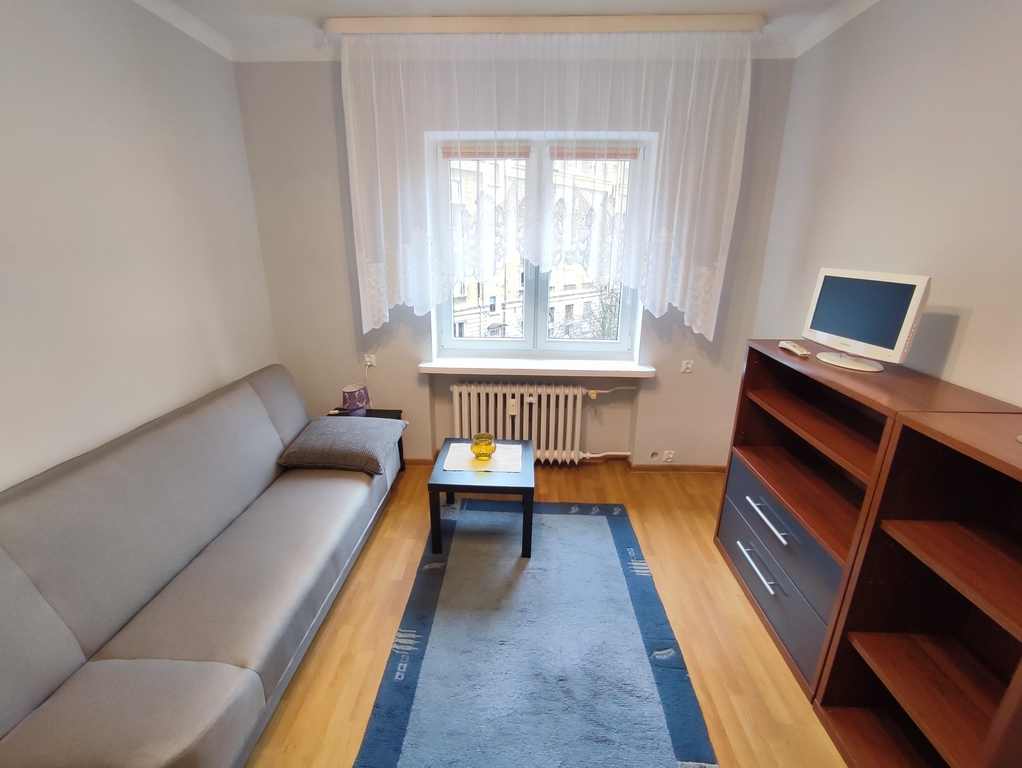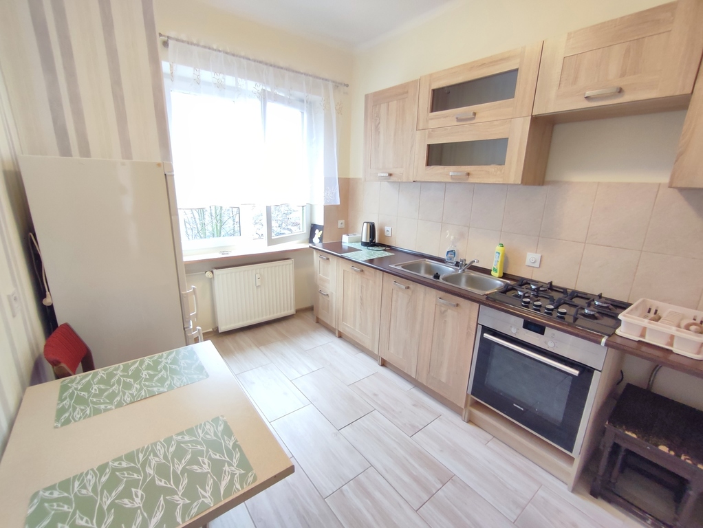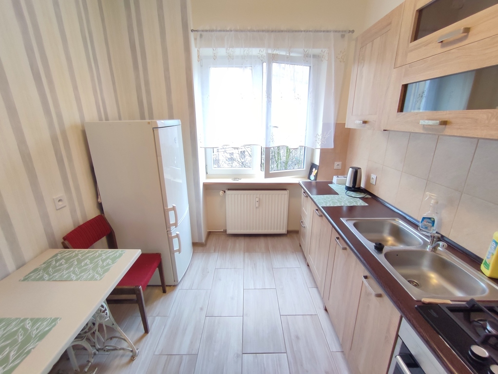 The apartment is available from mid-November 2020 !!! Offer for renting a two-room apartment with an area of 47.55 m2 located on the second floor of a four-story building in the very center of Szczecin. The property is located at Mazurska Street – 40 meters from Lotników Square, where one of the most beautiful monuments in Szczecin is located – the Colleoni monument. There is a lot of greenery in the property's yard (numerous trees and lawns) and a new playground for children. The apartment itself consists of two rooms, 18.50 m2 and 11.95 m2; separate kitchen with a window of 8.50 m2; bathroom with toilet and hall. The apartment is offered for rent after renovation. All installations have been replaced. The rooms have new panels on the floor, smooth and painted walls. In the larger room there is a fold-out sofa and a wall unit, and ultimately it will be equipped with a TV set and a table with chairs. In the smaller room there is another fold-out sofa, a large – wide chest of drawers and a wardrobe with a mirror and drawers. In the kitchen and bathroom, a uniform, modern tiles on the floor. In addition, the kitchen has new kitchen furniture plus an oven, gas hob, two-chamber sink and an electric kettle (the question of inserting a dishwasher remains to be agreed). In the kitchen there is also a fridge and a table with chairs (not visible in the photos). In the bathroom, new tiles on the walls plus a bathtub with tiles, a washbasin with a cupboard, a toilet bowl, a washing machine and a ladder heater. There is also a new gas heater in the bathroom to heat the water. Heating of the apartment – city. All internal and external doors – new. PVC windows (including window doors in a larger room – no balcony). The rent to the community is 450 PLN (including municipal heating, water, garbage and renovation fund). Rental cost – PLN 1350 rent plus PLN 450 community rent plus meters (gas and electricity). Rental conditions: 1) Minimum rental period: 1 year. 2) The required deposit in the amount of one month's rent. 3) Occasional lease agreement with a notary public. Recommendable offer due to the attractive location of the property and the standard of the apartment itself. We recommend.