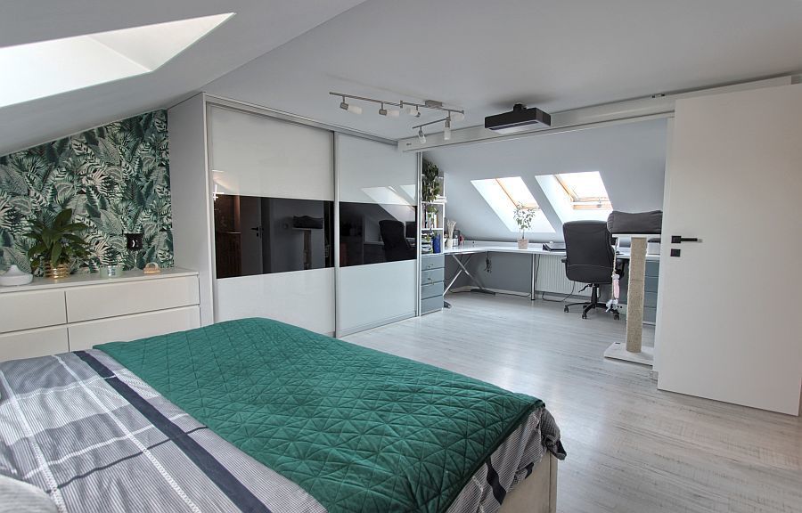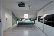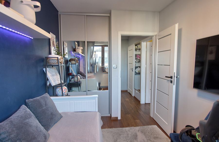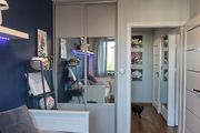 – a bedroom with storage space and a large built-in wardrobe,