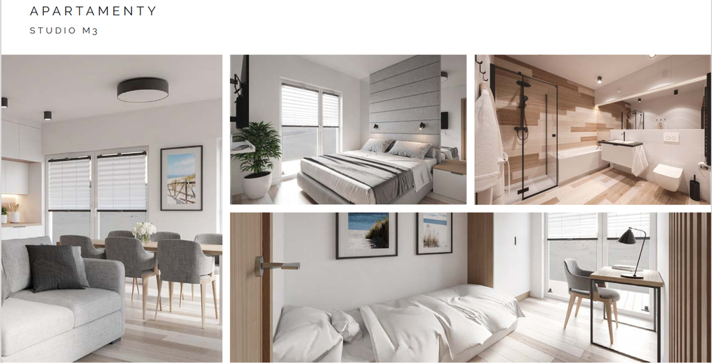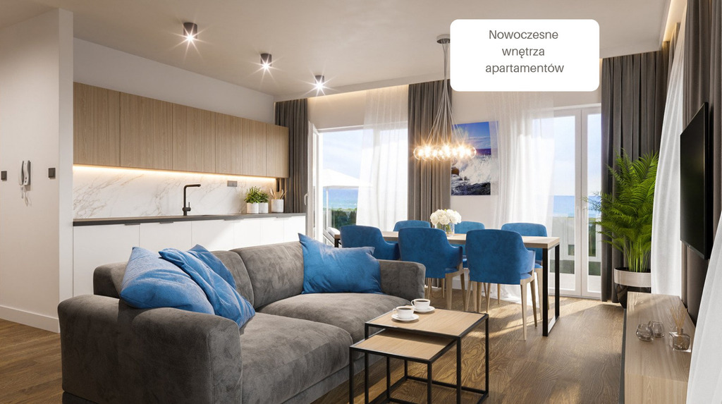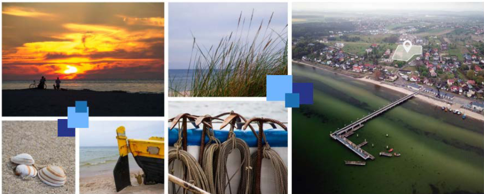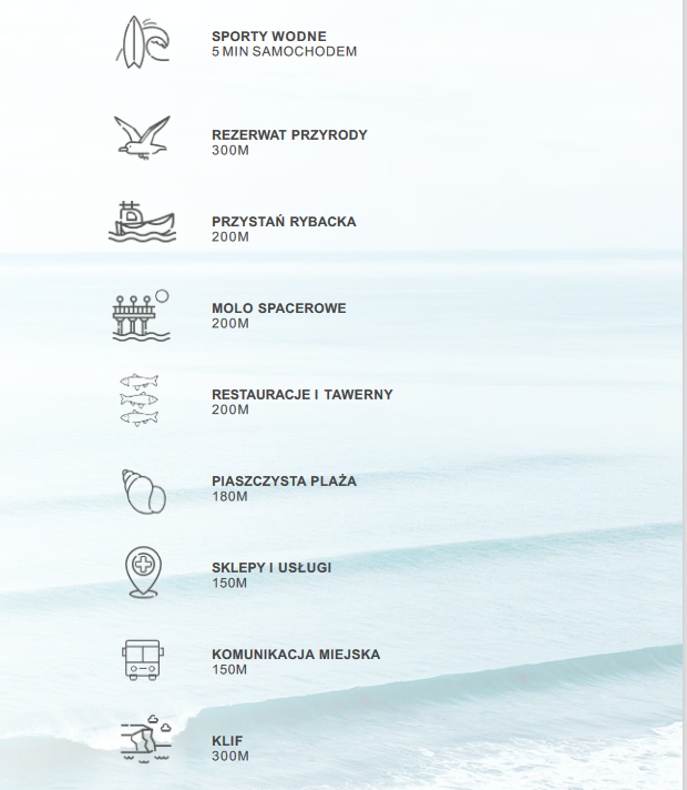 The complex is located in the Kosakowo commune, less than 14 km from Gdynia. The waterfront in the village has been modernized, a fishing harbor with characteristic Kashubian fishing boats has been established here. The new walking pier, with an unforgettable view, resembles the famous Sopot pier. The wide, sandy beach encourages you to rest and walk, and the nearby eateries offer fresh fish, and cafes tempt with sweet delicacies. There are many walking and cycling routes in the area, which delight with the seaside panorama. It is a perfect place for water sports – e.g. kitesurfing, windsurfing. There is a grocery store, a pharmacy, an ATM and a gas station nearby, as well as a public transport bus stop located a few dozen meters away. The travel time by public transport to the Gdynia Główna Railway Station is only about 25 minutes, by car about 15 minutes.