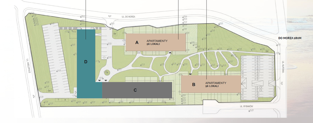 The complex is located in the Kosakowo commune, less than 14 km from Gdynia. The waterfront in the village has been modernized, a fishing harbor with characteristic Kashubian fishing boats has been established here. The new walking pier, with an unforgettable view, resembles the famous Sopot pier. The wide, sandy beach encourages you to rest and walk, and the nearby eateries offer fresh fish, and cafes tempt with sweet delicacies. There are many walking and cycling routes in the area, which delight with the seaside panorama. It is a perfect place for water sports – e.g. kitesurfing, windsurfing. There is a grocery store, a pharmacy, an ATM and a gas station nearby, as well as a public transport bus stop located a few dozen meters away. The travel time by public transport to the Gdynia Główna Railway Station is only about 25 minutes, by car about 15 minutes.