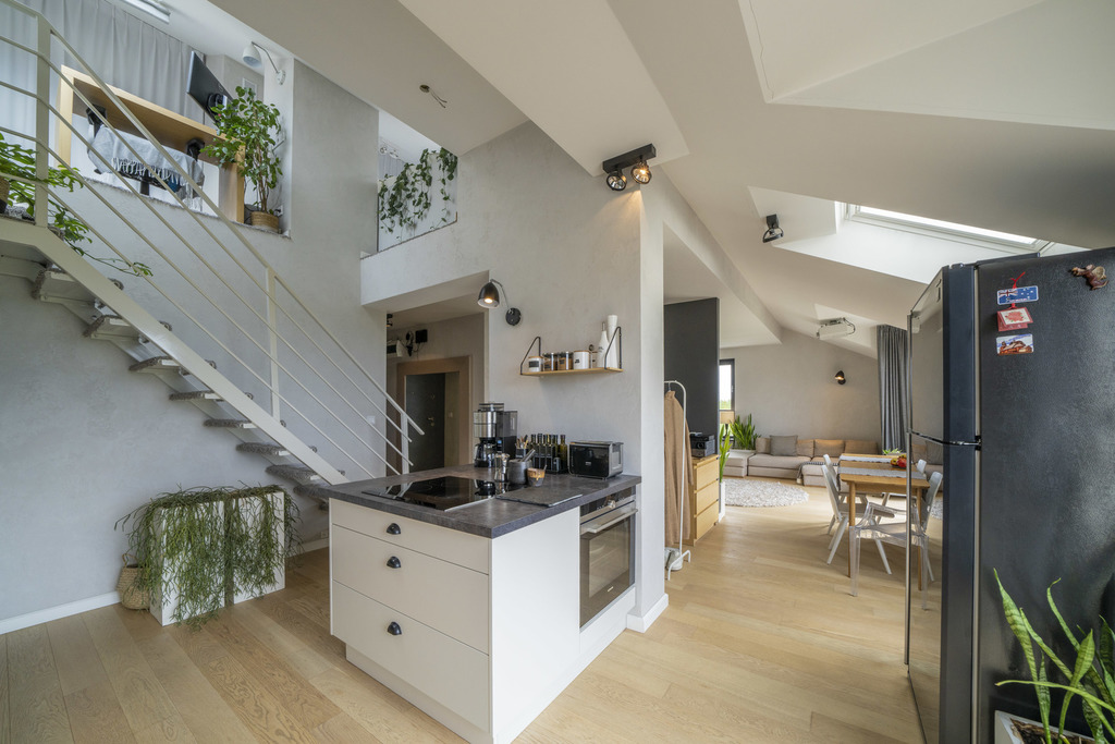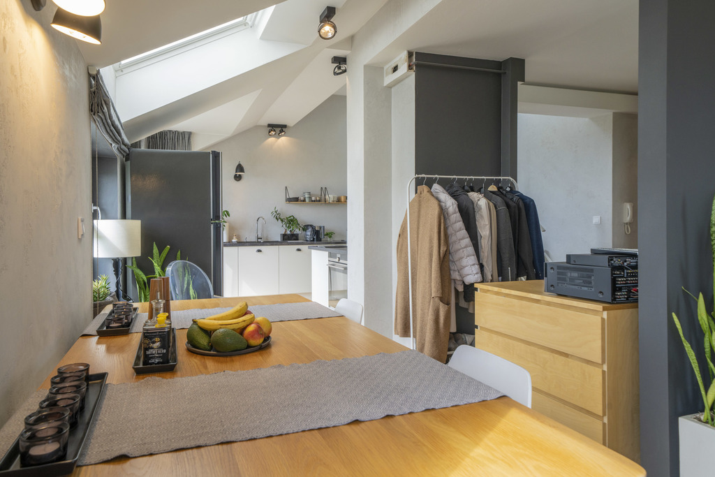 A 4-room, two-level, modern apartment for rent, located in Warszewo. The property is located on the second floor, in a modern, low-rise building completed in 2015. The apartment with an area of 88.64 m2 on the first level consists of: a spacious living room, open large kitchen (for use: Siemens oven with steam cooking function) , dishwasher, Sharp fridge, electric hob, dining area with a table, bathroom and a room with a large separate wardrobe built in the carpentry system.The space is enlarged by two beautiful balconies (one has an exit from the living room, the other from the kitchen). On the first floor there is a bedroom, wardrobe and study.The upper level of the apartment has air conditioning.The apartment is interestingly designed to give the impression of a loft space, with lots of green houseplants.The combination of the first and second floors with an impressive mezzanine makes a great impression.The property is modern but cozy.The space is elegant and well-maintained All rooms are fully furnished and equipped, and the property includes an underground garage. The property has gas heating (combination stove, thermostat control, steel radiators, panel radiators) and water from the municipal water supply. The rent is PLN 5,000 + administrative rent (apartment and parking space) PLN 531 (PLN 480 + PLN 51) + gas and electricity according to consumption.