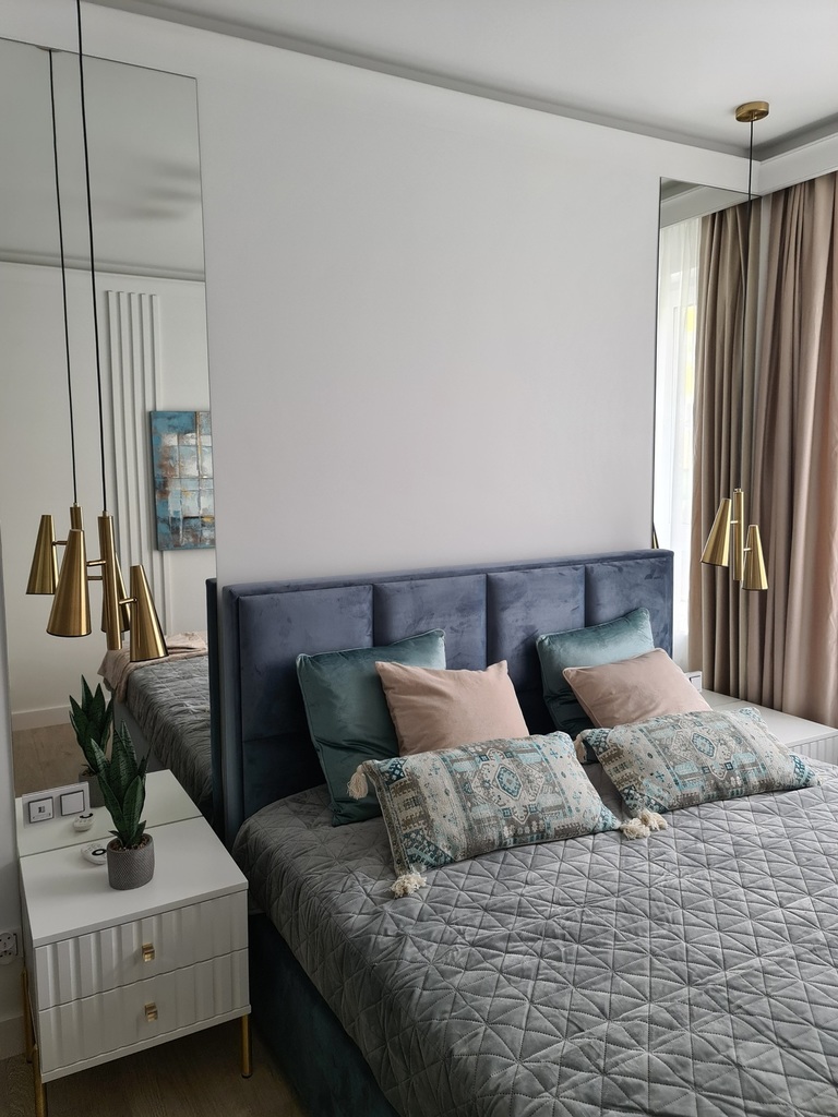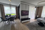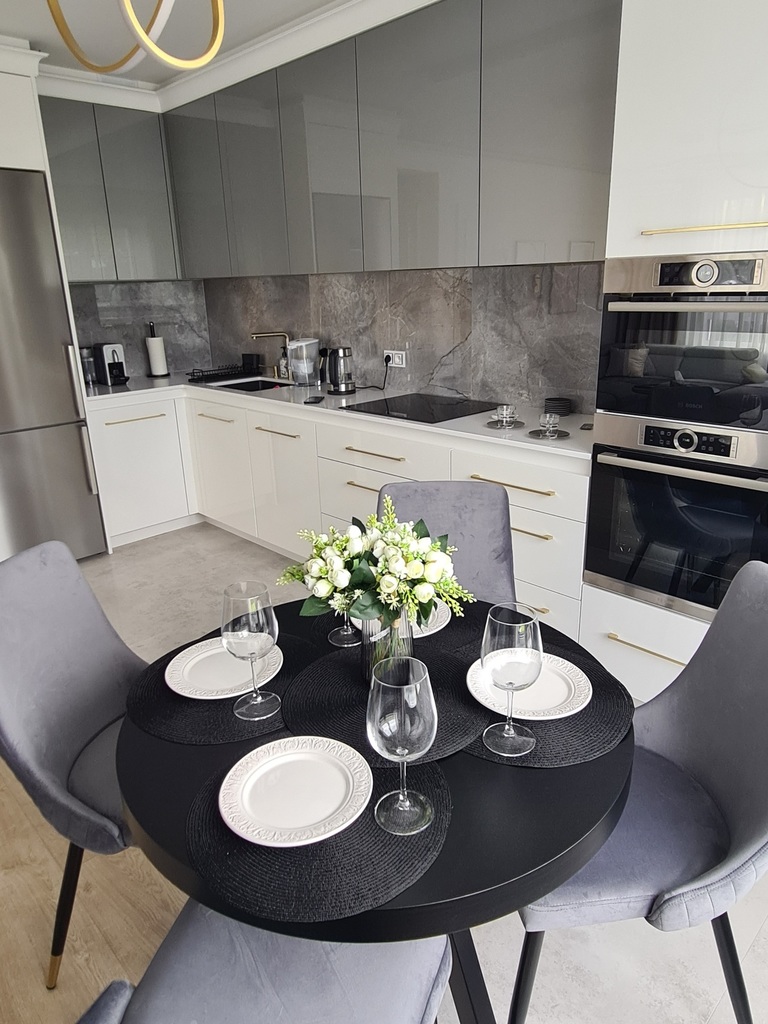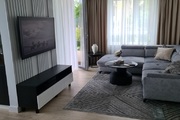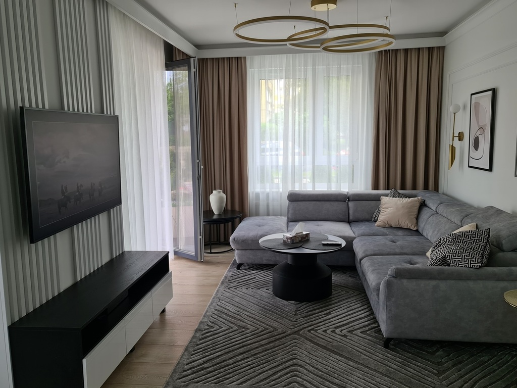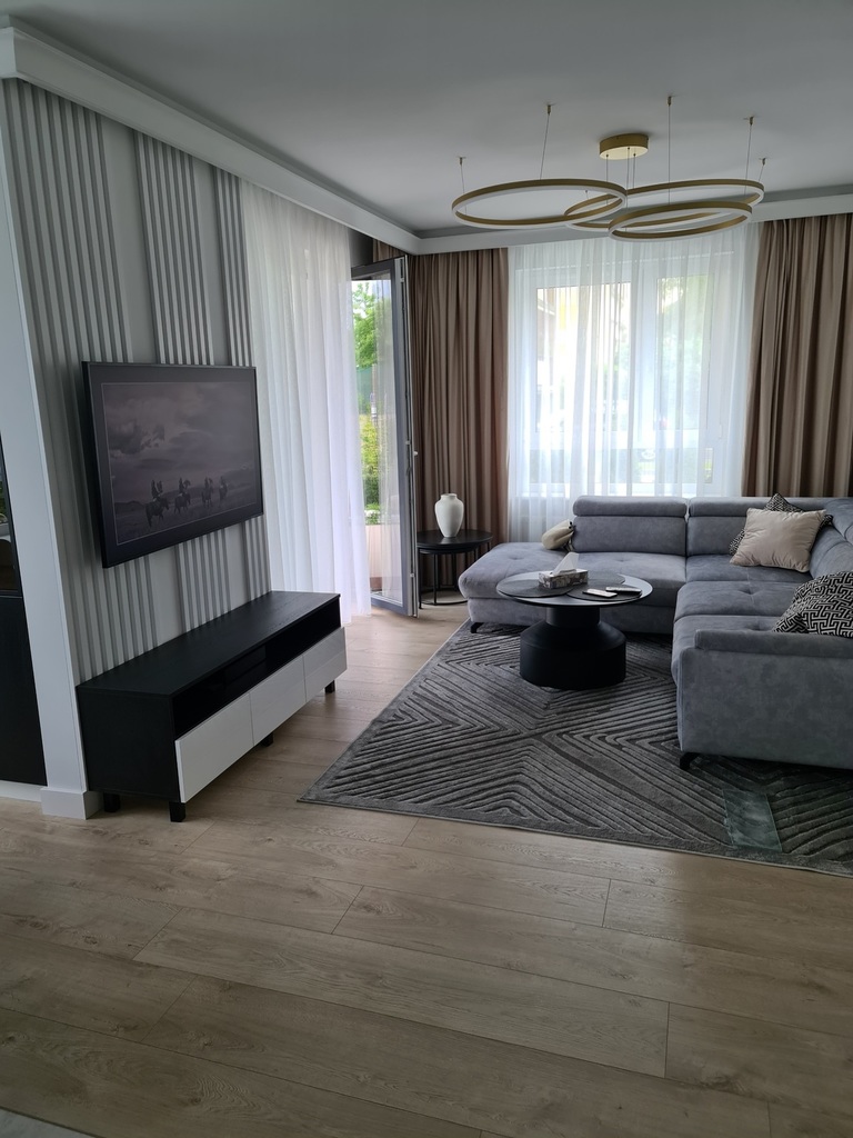 An elegant 3-room apartment for rent in a great location of Szczecin. The building will be put into use in November 2022. The apartment with an area of 67.46 m2 is decorated in a modern style. The property consists of 3 rooms: 2 bedrooms plus a living room with a dining area and a kitchenette equipped with kitchen furniture and necessary household appliances, the bathroom is equipped with a washing machine and a dryer, as well as electronically controlled underfloor heating, a bathtub, a shower, and a toilet. Calm and quiet neighborhood. The apartment is located on the ground floor and has a beautifully landscaped garden. Easy access to the city center by bus lines 88.98, 223.224, 226.244, 808.908. The apartment is fully furnished and finished with the highest quality materials. The tenant has a large 12m terrace with garden furniture. District heating with SEC (separate sub-meters, payable only during the heating season). City water – settled in the rent according to the indications of the sub-meter. The rent is PLN 4700 (including a parking space in the garage under the building) + administrative rent PLN 396 (including advance payments for CW, ZW, garbage) + electricity according to consumption. The apartment has active Internet (600 mb/s) and 138 TV channels (price: PLN 86). I cordially invite you to the presentation.