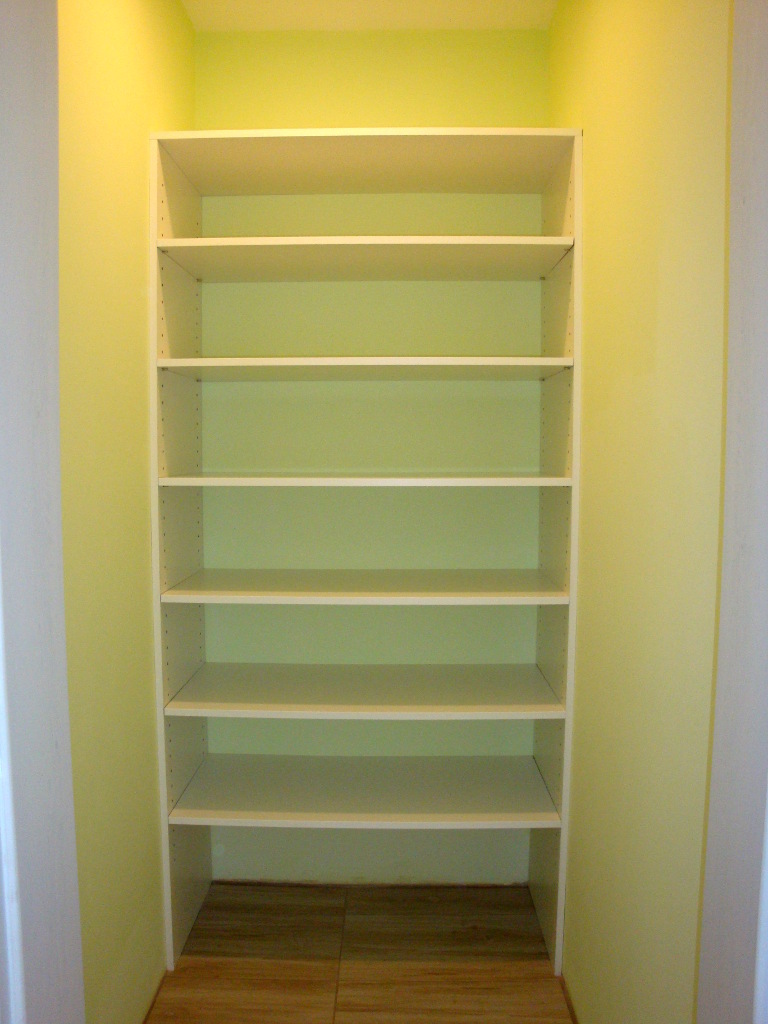 A small wardrobe with shelves and a hanger.