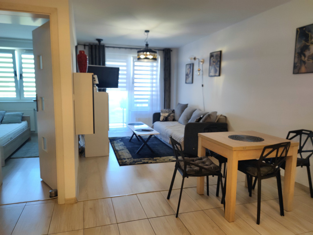 A large room with a balcony – equipped with a sofa bed, coffee table, chest of drawers, TV.