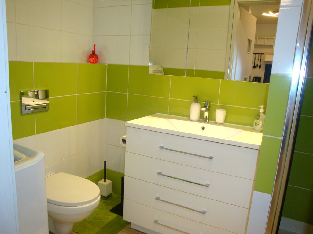 Bathroom with toilet – shower, washing machine.