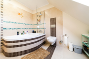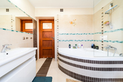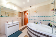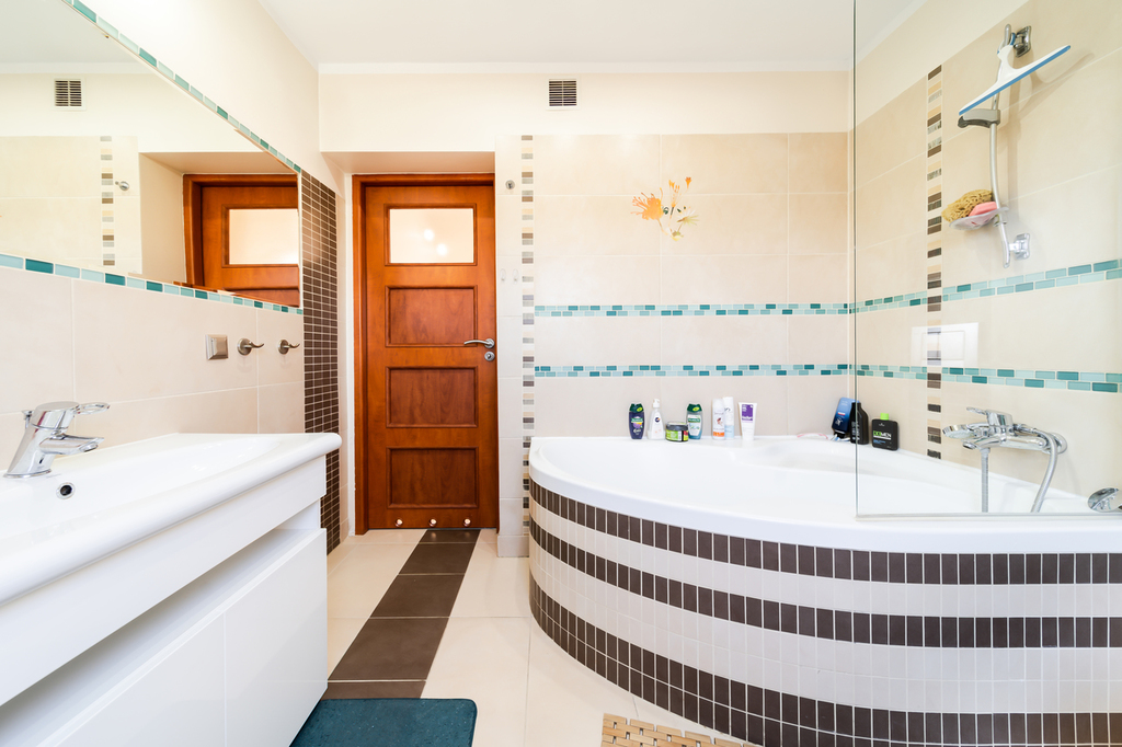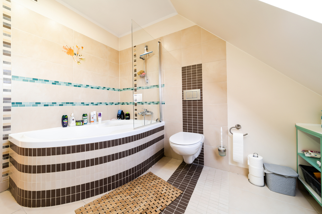 – a bright bathroom with a bathtub on which a glass screen has been installed.