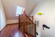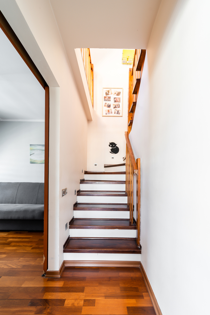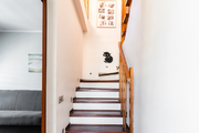 A comfortable wooden staircase leads to the second level. Here are: