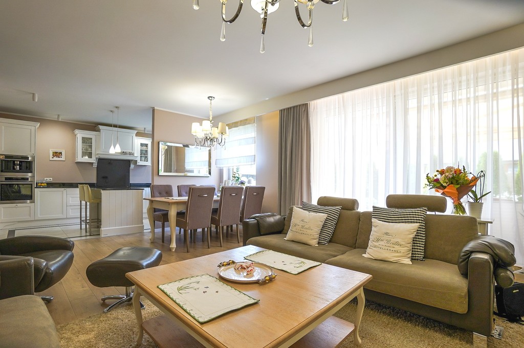 The apartment is divided into a day zone (living room with a terrace, kitchen with pantry, hall) and a sleeping area with a comfortable wardrobe and bathrooms. In the living area, in the bathrooms and in the laundry room, underfloor heating was distributed, in the bedrooms and in the dressing room, radiators were installed.