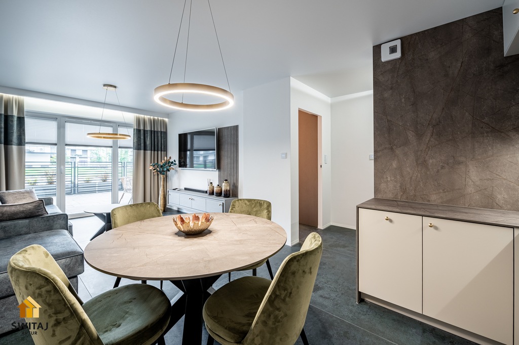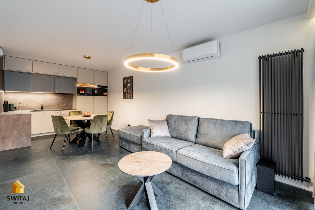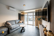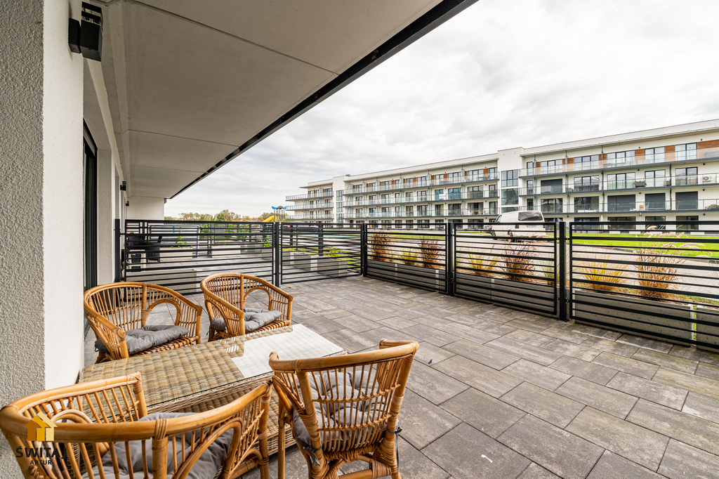 BUY, RENT, EARN! ALL YEAR APARTMENT WITH AIR CONDITIONING, BALCONY, TERRACE, PARKING SPACE AND ACCESS TO THE POOL! The apartment consists of two rooms, a bathroom, a corridor, a balcony and a terrace. The apartment is sold finished to a high standard and fully equipped. Air conditioning, external electric blinds, underfloor heating and classic district heating radiators. The rooms are finished and equipped to a high standard. Expandable ceilings, 120x60cm board floors, custom-made kitchen furniture and lounge furniture imported from Italy, inductive phone charging points and other goodies. Everything NEW, unused. for children. The parking lot is on the inside of the yard – the parking space is wide Residential – it is possible to obtain a mortgage for the purchase It is possible to rent the apartment to the operator (there is no such obligation), who offers comprehensive services regarding the management and rental of real estate, you can also use the apartment for own needs or rent independently. the photos show the interior of the apartment during the arrangement process – it will be fully finished and equipped when issued to the buyer.
