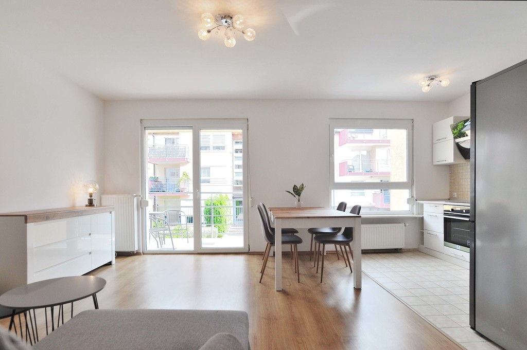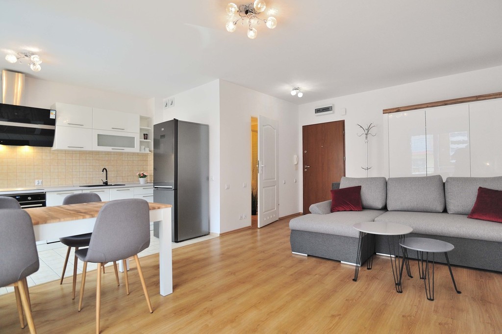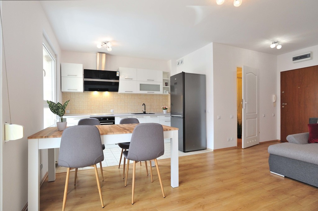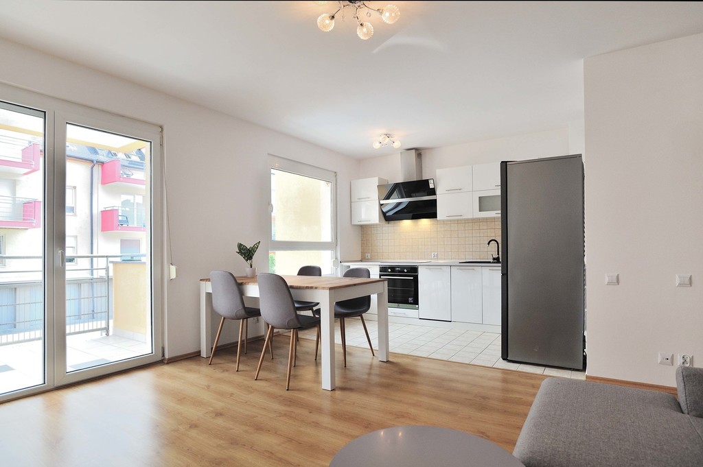 Only here we present you the offer of renting a studio apartment located at ul. Rainbow Gardens in Warzymice. APARTMENT DESCRIPTION: An apartment for rent, located on the first floor of a 2-story building. The total area of the studio is 32.8 m2, it is fully furnished and equipped. Heating and hot water from the municipal network. The apartment has a room with a kitchenette and a bathroom with a toilet. The bathroom is equipped with a shower, toilet, washbasin, washing machine and ladder radiator. The kitchen is furnished and equipped with household appliances – induction hob, electric oven, fridge-freezer, absorber. At the entrance door there is a standing hanger for outerwear and a spacious wardrobe. The room has a fold-out corner sofa, two coffee tables, a table with four chairs, and a chest of drawers with a lamp on it. From here there is also access to the balcony, where there is a table with two chairs. SETTING: The apartment is located in a gated housing estate called Tęczowe Ogrody, where there are two playgrounds and pitches for football, basketball and tennis. Nearby there are: a jewelry store, a hairdresser, a pharmacy, a pizzeria, parcel lockers and a shopping center. The close proximity to bus stops of daytime lines No. 241, 243 and night line No. 523 allows you to freely travel to the center of Szczecin. COSTS: the rent if paid on time is PLN 1,700 + PLN 407.44, the so-called administrative rent + electricity fees according to consumption. I invite you to a presentation, keys in the office. Please contact me by phone on working days from: 9am-4pm (on other days and hours please text me).