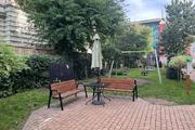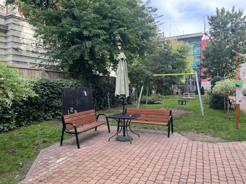In front of the block, in a fenced area: playground, swings, carousel, benches with tables and a place to lock a bicycle.
