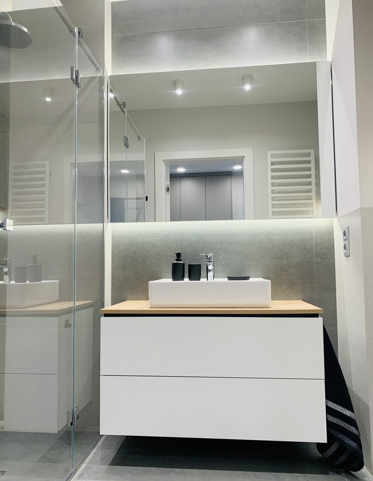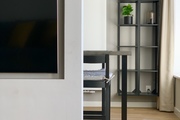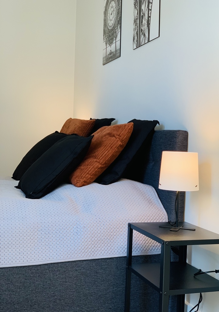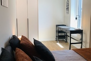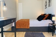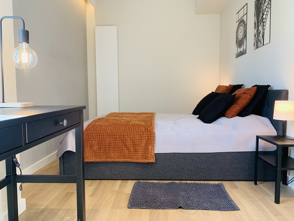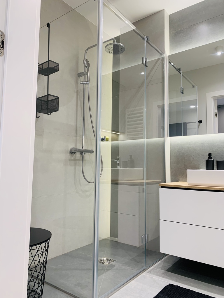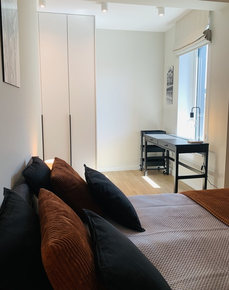 A bedroom with a wide double bed, a spacious built-in wardrobe and a desk. A spacious bathroom with a large, comfortable shower cabin.