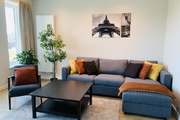 Modern furnished living room with a sofa. Bright kitchen equipped with all household appliances.
