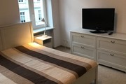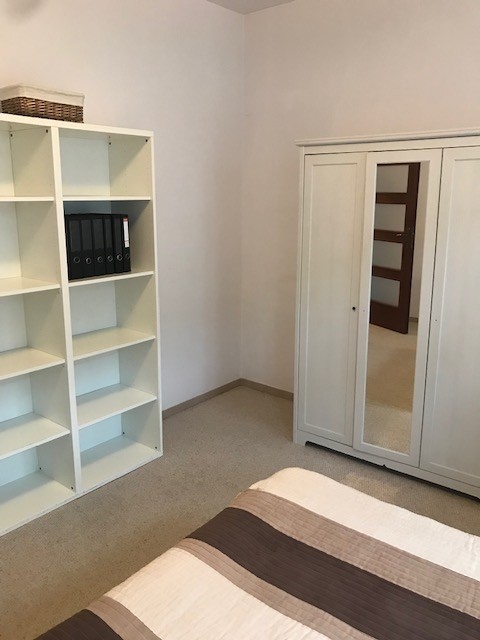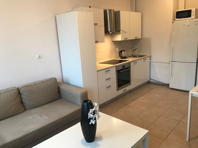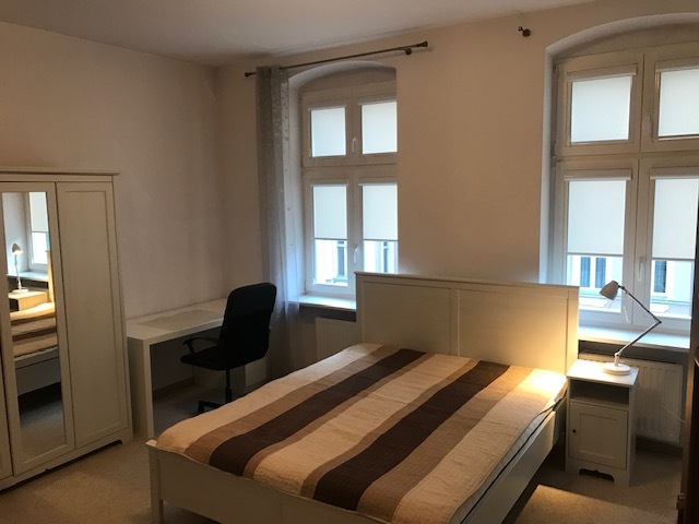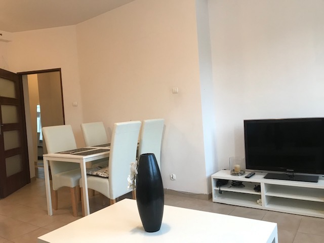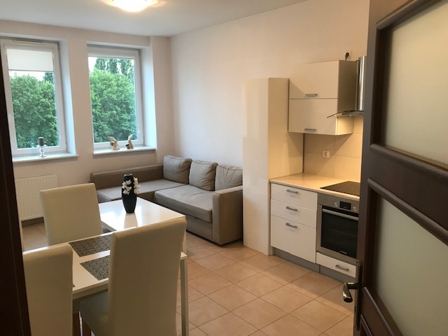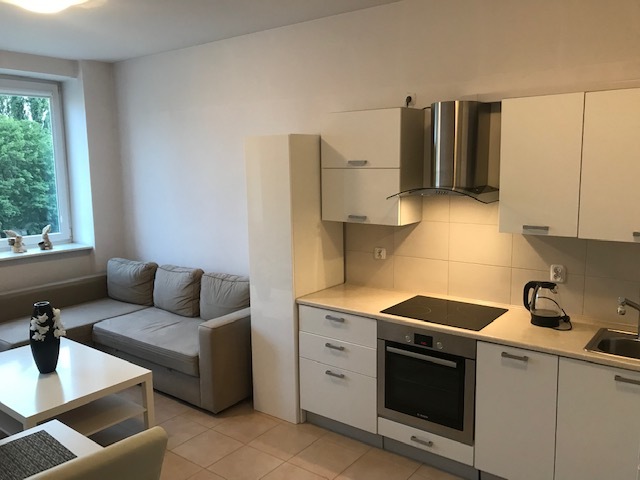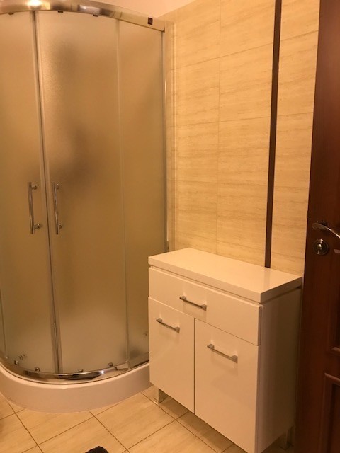 Apartment in a renovated tenement house. A modern elevator, smoke detectors in the staircase and in the premises. The entire premises have terracotta floors, white painted walls, PVC windows on the courtyard side, and wooden windows with decorations on the street side. There is one room on the street side, two rooms on the yard side, one with access to the balcony (1.6 m x 3.4 m). The bathroom has a built-in shower, a suspended toilet and a bidet. Interior doors, anti-burglary entrance doors, video intercom, alarm installation. The property includes a storage room with an area of 8.69 m2. The apartment is furnished and equipped. Entrance to the tenement house from the street and yard. Possibility to rent a parking space near the building for an additional fee. Rent PLN 2,950.00 (with 300 Mb Internet) + community PLN 370 + meters: heating (city), electricity, water.