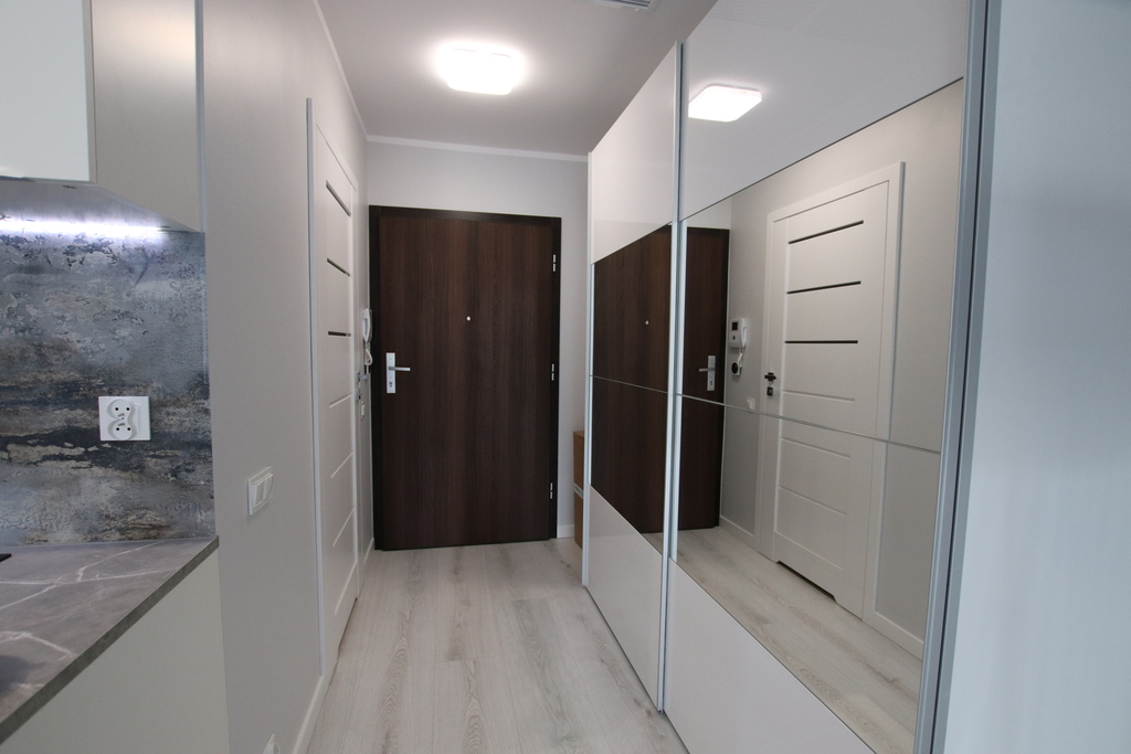 A luxury one-room apartment with an area of 30.73 m2 for rent in the Hanza Tower. The apartment is located on the 4th floor and consists of a living room with a kitchenette, a hall and a bathroom. The interior height of 3 meters creates a space with a lot of natural light, thanks to large glazing.