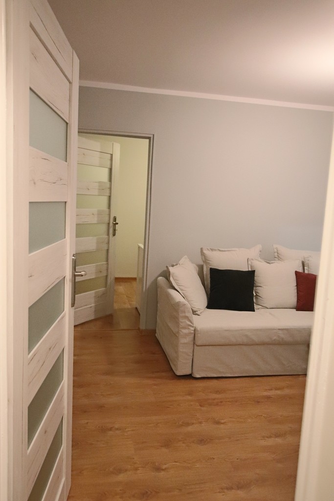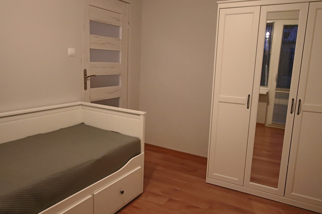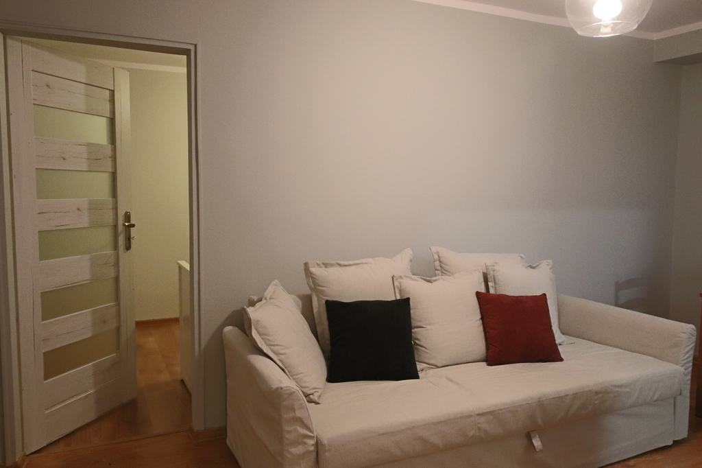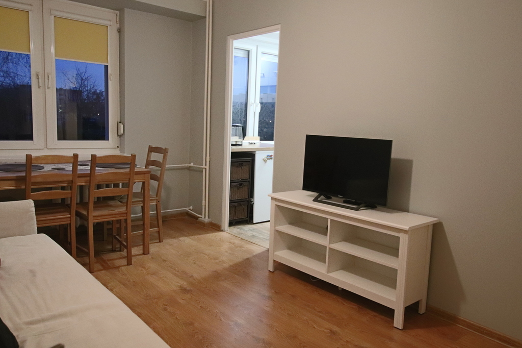 Pomorzany, 2 rooms 34 m2 with a balcony, located on the ground floor of a 4-story block. Apartment after renovation, as new, fully furnished and equipped, first tenants after renovation. It consists of two rooms, a kitchen, a corridor and a bathroom. From the living room there is an entrance to the bedroom with a balcony and to the kitchen, and from the corridor to the bathroom. External blinds on the windows. Insulated building, nice new facade, low rent with heating and hot water. Fees: rent PLN 1,0900, administrative rent PLN 420, deposit PLN 1,900 (returnable after the rental agreement). All the furniture is new, there is a table and chairs in the living room, a sofa, a long TV stand, a double fold-out bed in the bedroom, a large wardrobe, a corridor, a large built-in wardrobe, a kitchen with custom-made furniture and a bathroom with a shower cabin and cabinets for cosmetics and cleaning agents . The apartment is clean and tidy, very good standard, for the most demanding client. No pets. The offer is recommendable due to its location, close to public transport, schools, universities, hospitals, shopping centers and shops. To live immediately, I invite you to the presentation