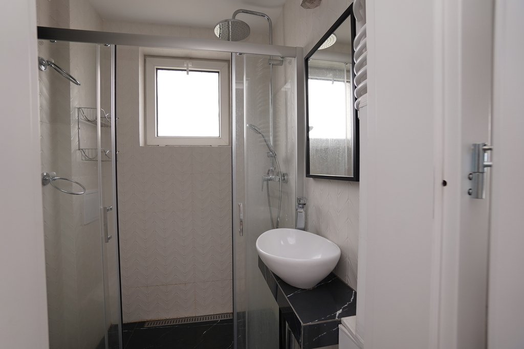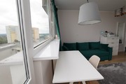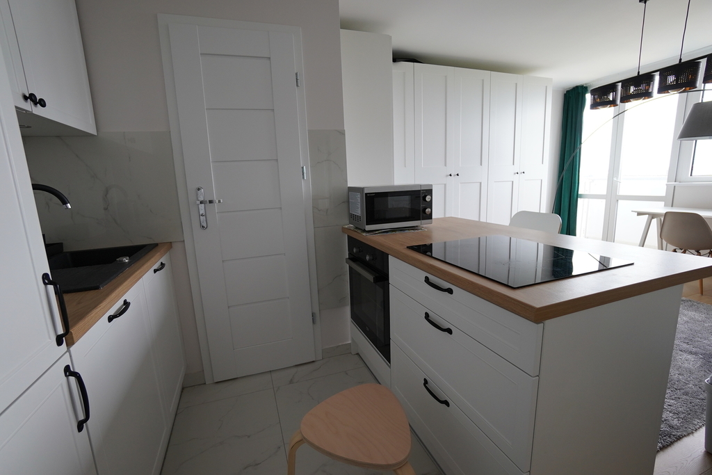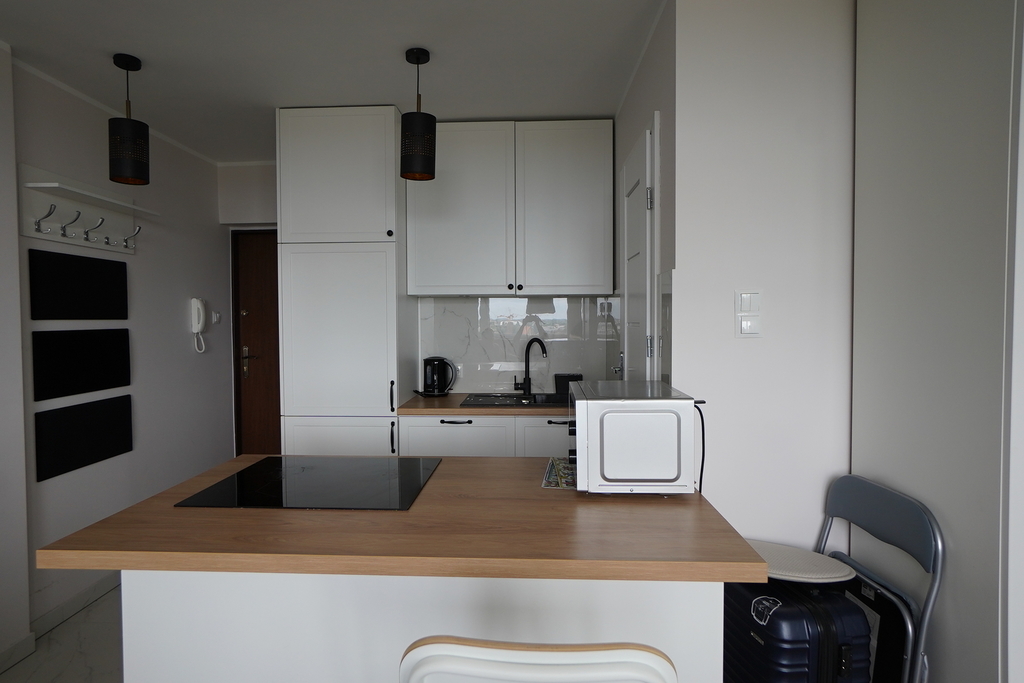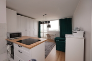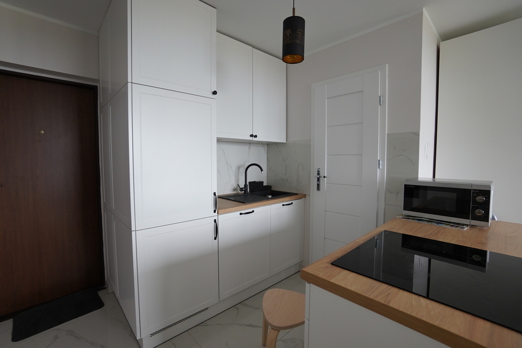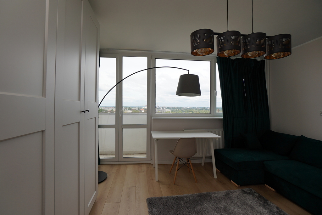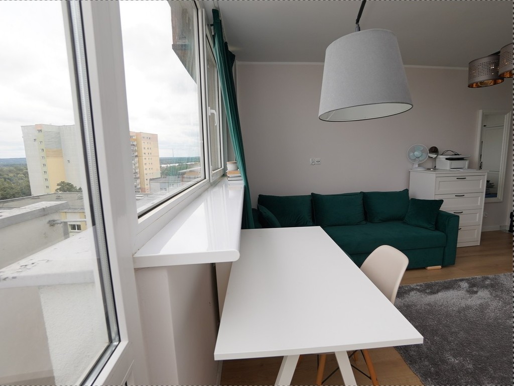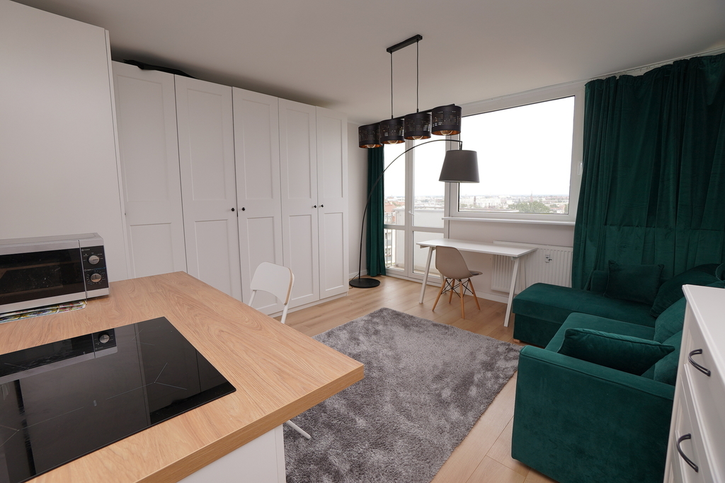 A studio apartment for rent in a quiet area of Szczecin Nowe Miasto. The apartment is modern, bright and cozy. It has a kitchenette with an island, the kitchen furniture includes a fridge, freezer, dishwasher, sink, electric hob, oven and washing machine. The room has a fold-out sofa, a very spacious wardrobe and access to the balcony. The bathroom has a toilet, washbasin and a large, comfortable shower cabin.