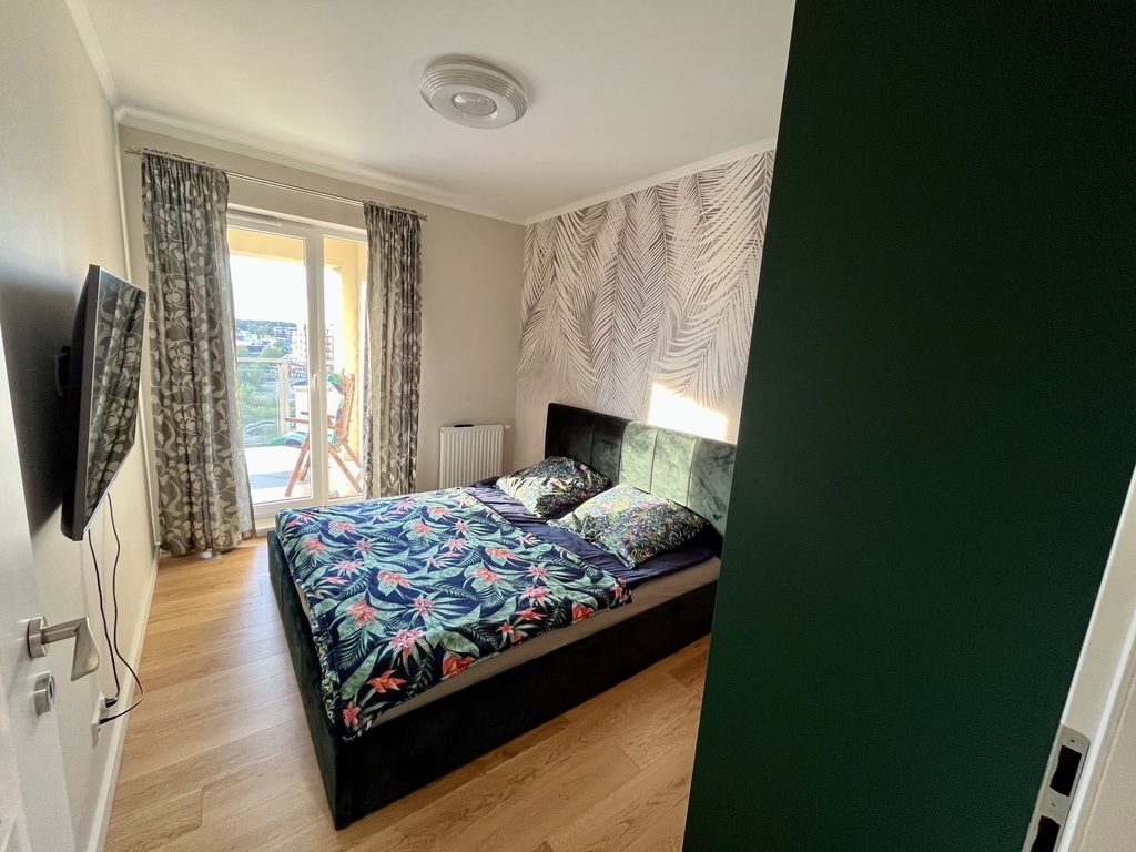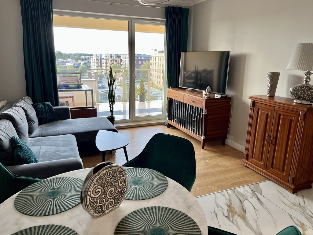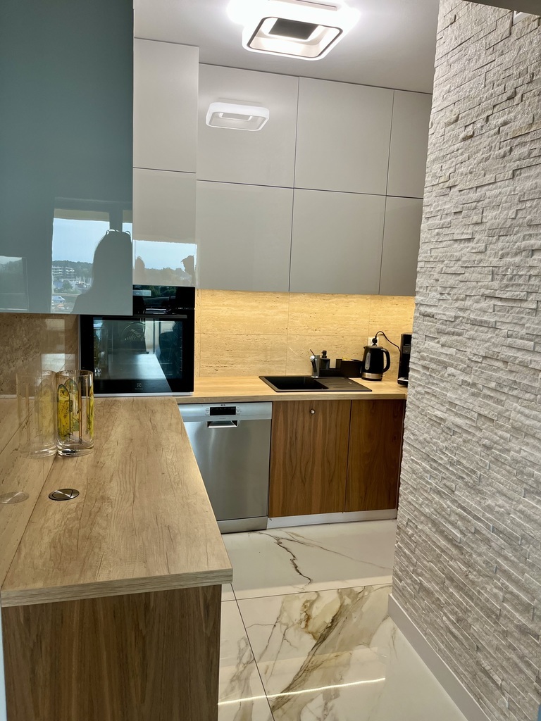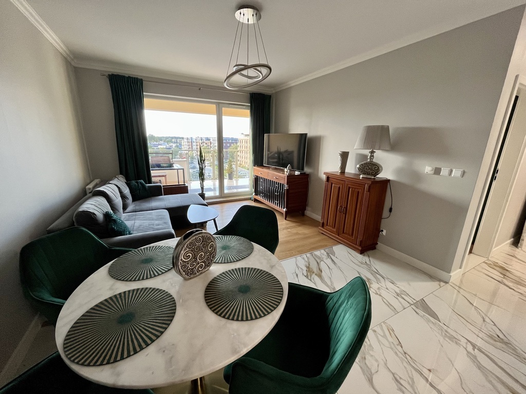 I am offering for sale a beautiful two-room apartment in a new building in a prestigious housing estate with interesting and unique architecture. The estate has beautiful and well-kept greenery, external and internal parking spaces, and playgrounds. Spacious housing estate, monitored, illuminated at night, a short distance from the city center (5 minutes by public transport). The apartment is located on the first floor of a building with an elevator with a north-west window. The apartment is practically new, without traces of use, finished with high-quality materials. There is natural wood on the floor (oak), the walls are covered with plaster and finished with a ceiling strip, in the bathroom and partly on the floor there are multi-format slabs and marble window sills. Hallway: permanently built-in wardrobes. Terrace 13 m2 finished with a view of the sunsets. Great location, close to the Kołobrzeg ring road and the city center. The apartment can be purchased with a parking space in the underground garage. The price of a parking space is PLN 50,000 (paid additionally). The apartment consists of a living room with a kitchen open to the living room, a bedroom and a bathroom. Everything arranged by an interior designer. The administrative rent is PLN 450/month. The apartment can be handed over immediately after the deed. The permanent buildings remain, including a kitchen with built-in appliances.